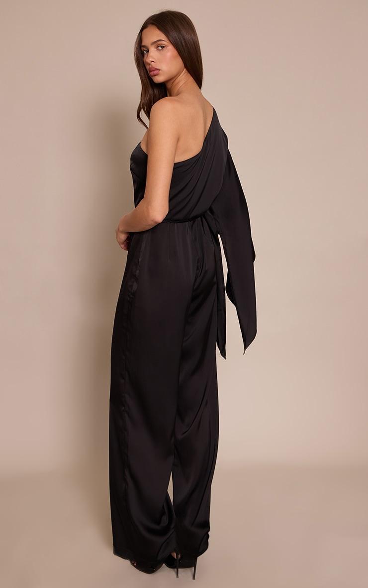Artful structure defines your presence, effortlessly. The black satin floaty one shoulder tie waist jumpsuit makes an immediate statement with its elegant asymmetric neckline, leading to a dramatic, floaty sleeve that drapes with knowing ease. A subtle tie waist cinches the silhouette, flowing into refined wide-leg pants for an elongated finish. Perfect for any evening, complete this look with sleek black kitten heels and a sharp white shoulder bag for a confident, polished aesthetic.Length approx 155cm/61inch (Based on sample size US 4)Model wears size UK 8/ EU 36/ AUS 8/ US 4Model Height - 5ft 9inchp]:!mb-4inch>Brand: PrettyLittleThingCategory: DressesProduct type: Wide Leg JumpsuitColor: BlackMaterial: SatinSleeves: LongOccasion: Evening