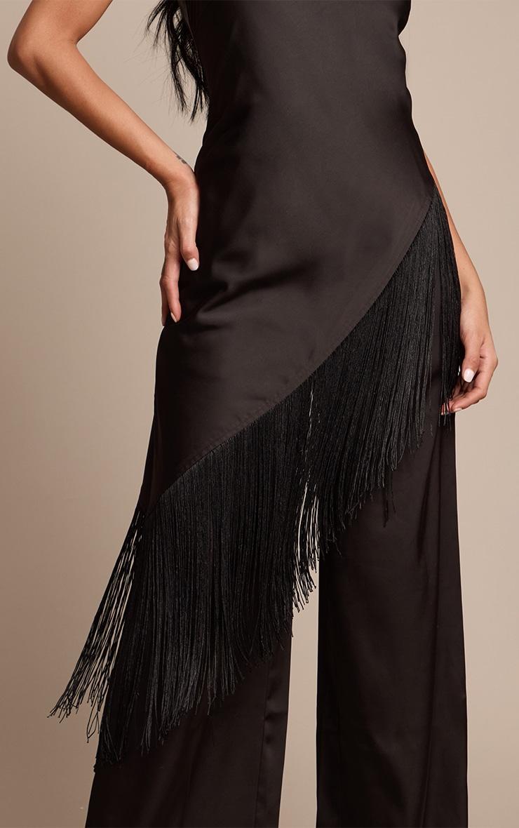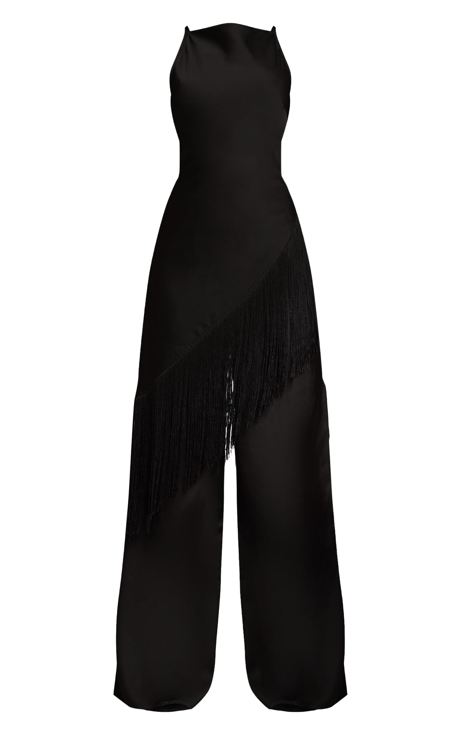 Command attention in the black satin fringe detail jumpsuit. Its high sculpted neckline, slender straps, and dramatic fringe sweep gracefully over wide-leg pants. The ultimate statement piece for any special occasion. Style with sharp black heels and gold earrings for a confident look.Length approx 155cm/61inch (Based on sample size US 4)Model wears size UK 8/ EU 36/ AUS 8/ US 4Model Height - 5ft 6inchp]:!mb-4inch>Brand: PrettyLittleThingCategory: DressesProduct type: Tailored JumpsuitColor: BlackMaterial: SatinOccasion: Occasion