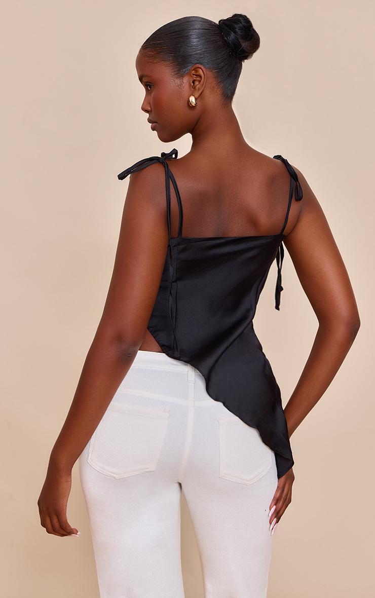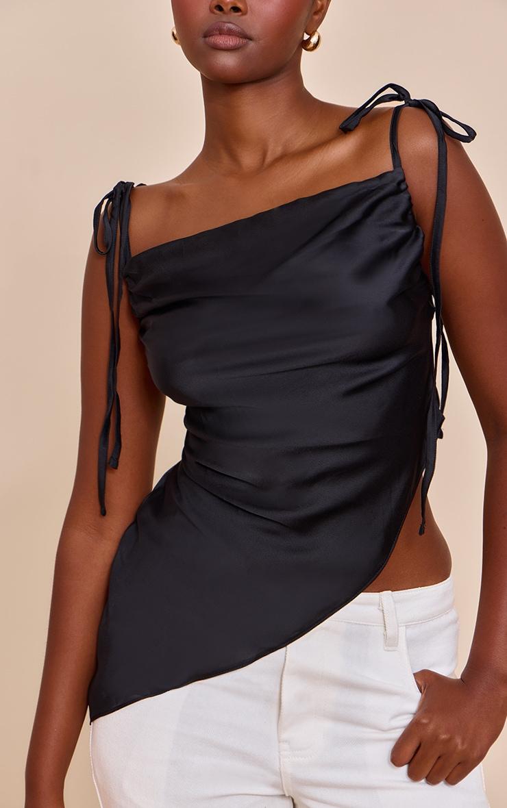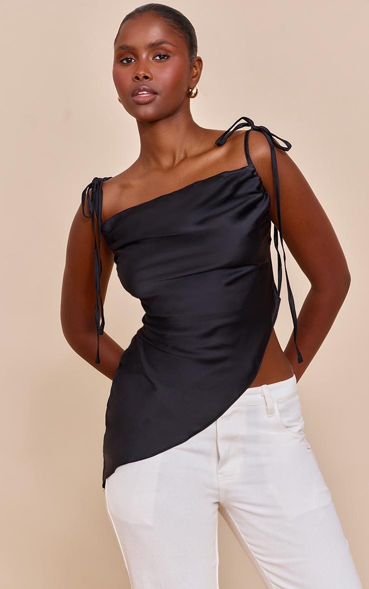 Keep it sleek in this black satin sheer asymmetric cami. Made from black sheer satin, this top has intricate tie fastening straps and a cascading asymmetrical hemline. Pair it with white pants, black heels and a black bag for a chic monochromatic look.Length approx 48.5cm/19inch (Based on sample size US 4)Model wears size UK 8/ EU 36/ AUS 8/ US 4Model Height - 5ft 9inchp]:!mb-4inch>Brand: PrettyLittleThingCategory: TopsProduct type: Cami TopColor: BlackMaterial: SatinDesign: PlainNeckline: CowlSleeves: SleevelessOccasion: Evening
