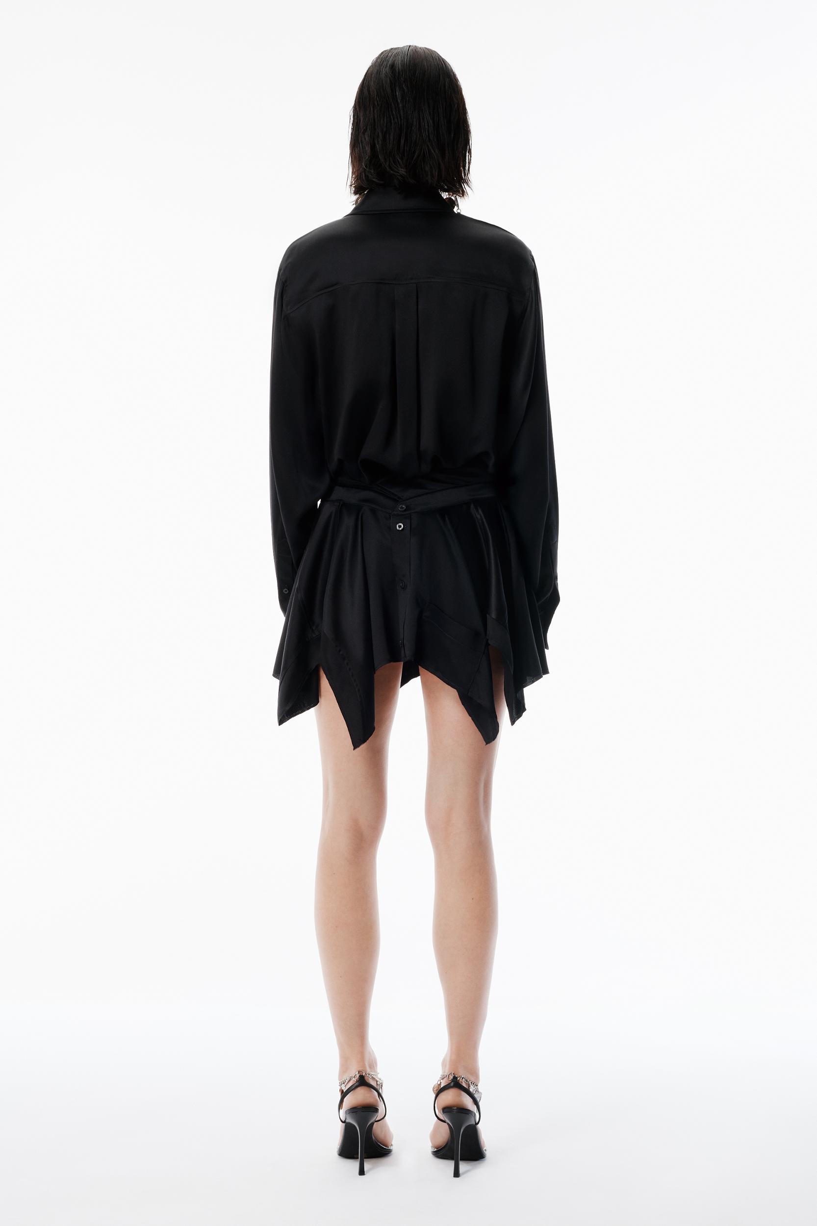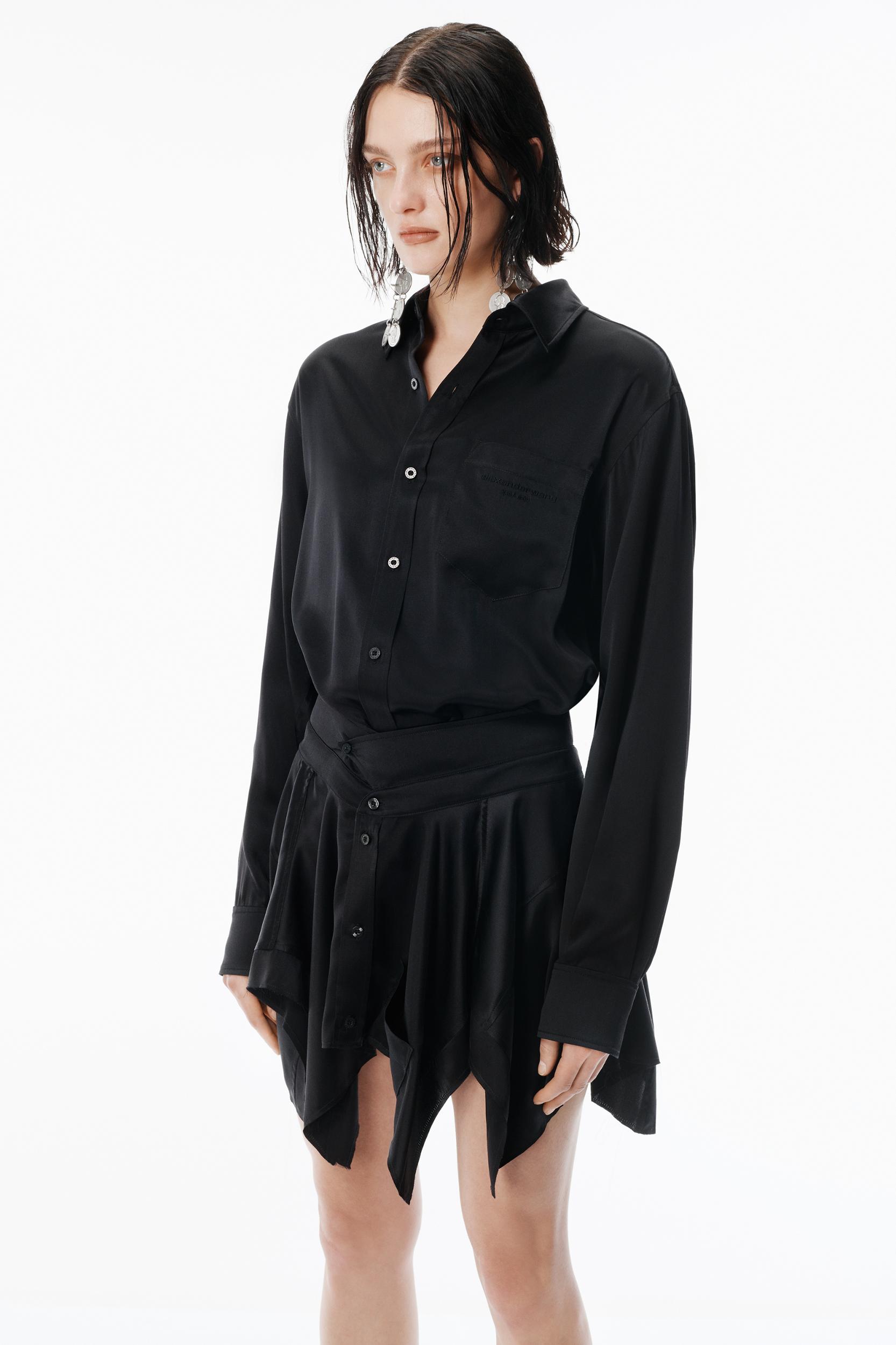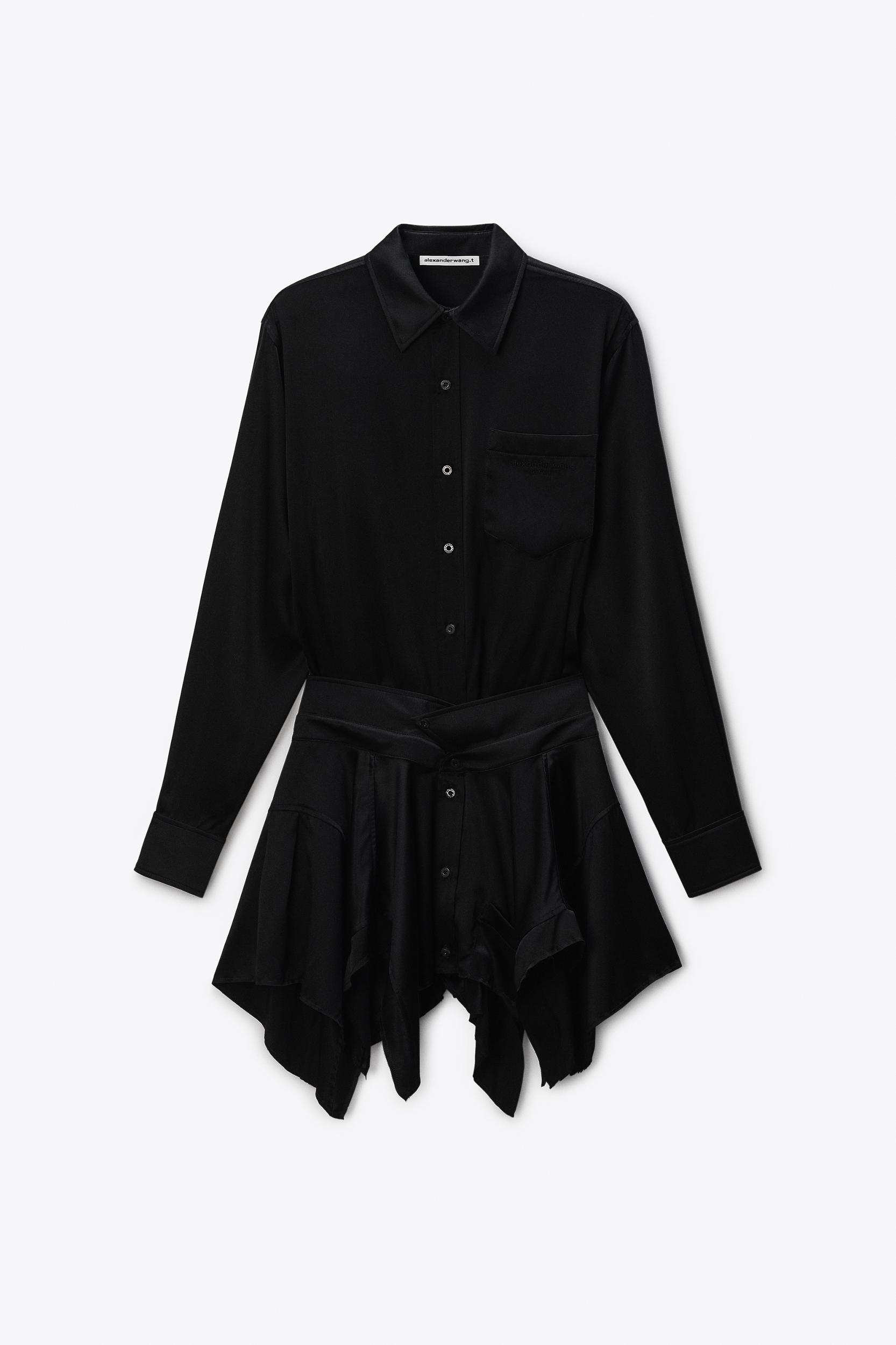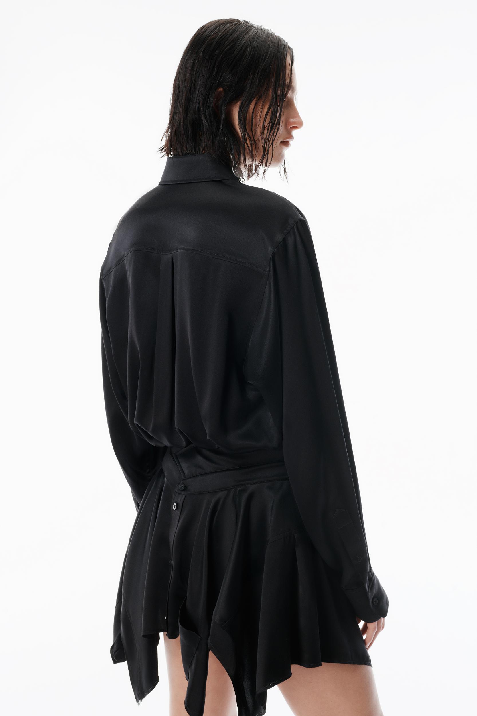 Pre-styled shirt dress constructed in black silk charmeuse, built from an oversized shirt silhouette with a deconstructed, multi-shirt skirt. Two shirts are buttoned together to form the skirt, with raw-cut sleeves and turned-up collars creating an uneven hem and waistband. Finished with classic logo embroidery at the chest pocket.