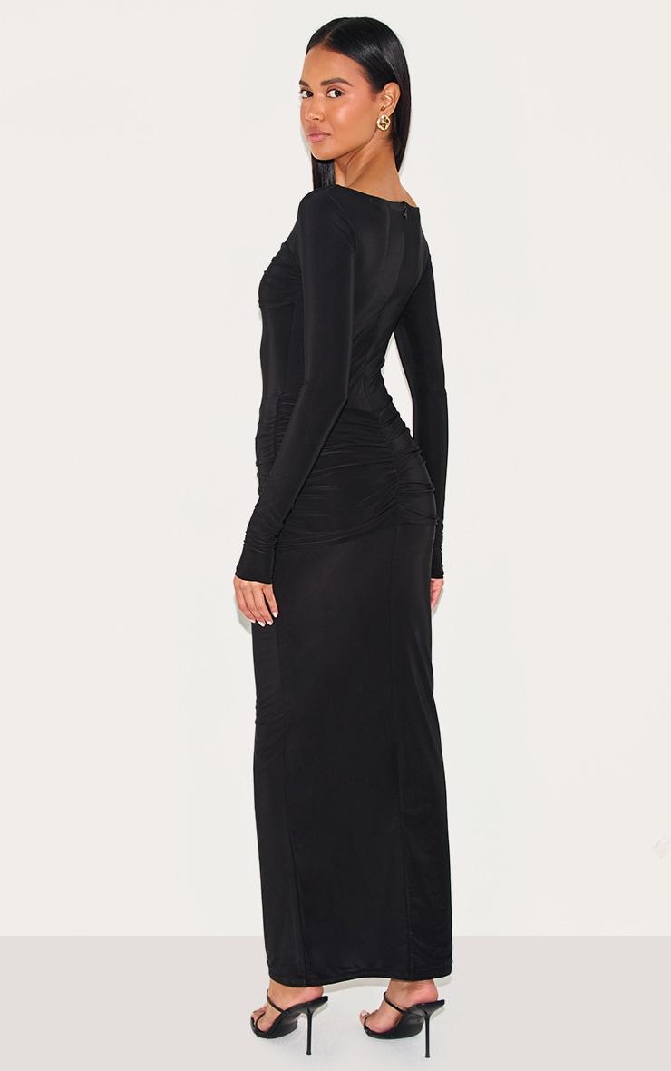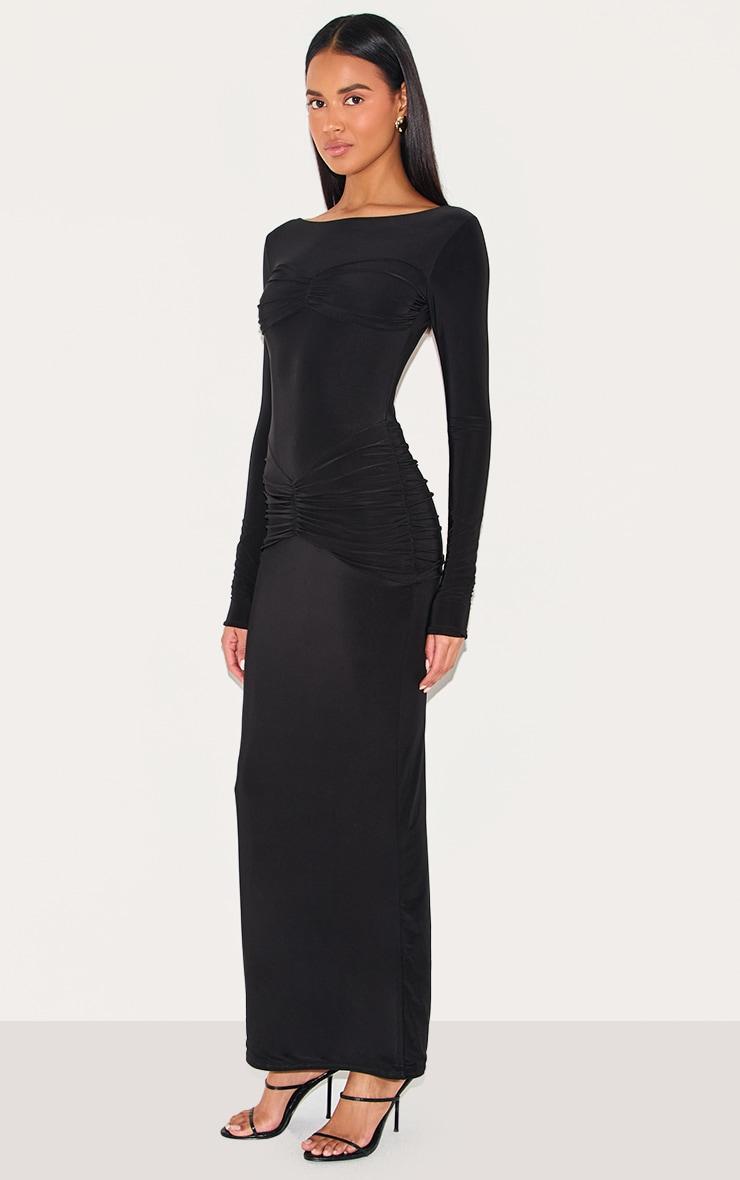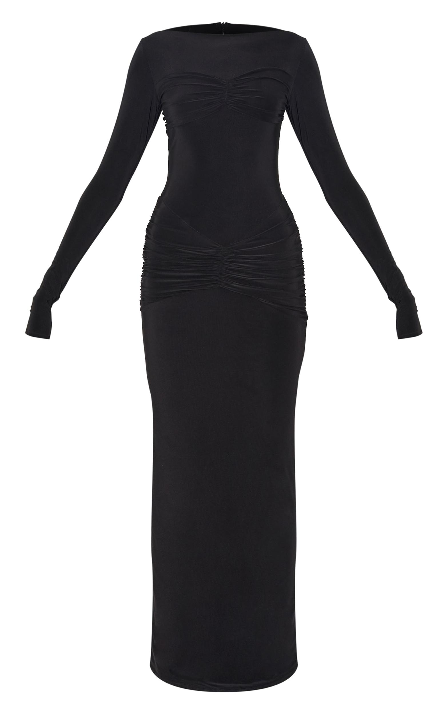Made from a black hue slinky material with ruched panel detailing, long sleeves and a flattering maxi fit. Style this black slinky ruched panel detail maxi dress with simple black heels and a mini bag for an effortlessly chic look.Length approx 134.5cm/53inch (Based on sample size US 4)Model wears size UK 8/ EU 36/ AUS 8/ US 4Model Height - 5ft 9inchp]:!mb-4inch>Brand: PrettyLittleThingCategory: DressesProduct type: Bodycon DressColor: BlackMaterial: Slinky JerseyDesign: PlainNeckline: CrewSleeves: LongOccasion: Evening