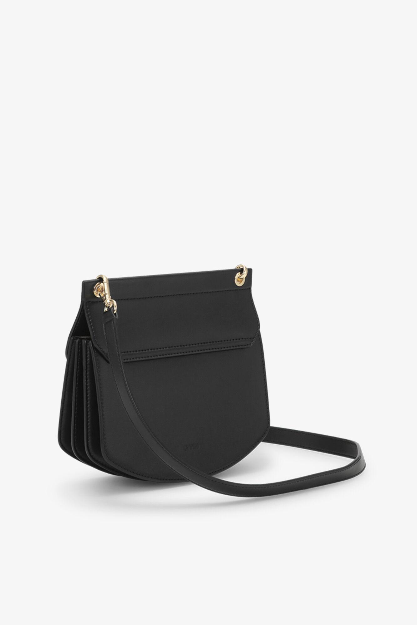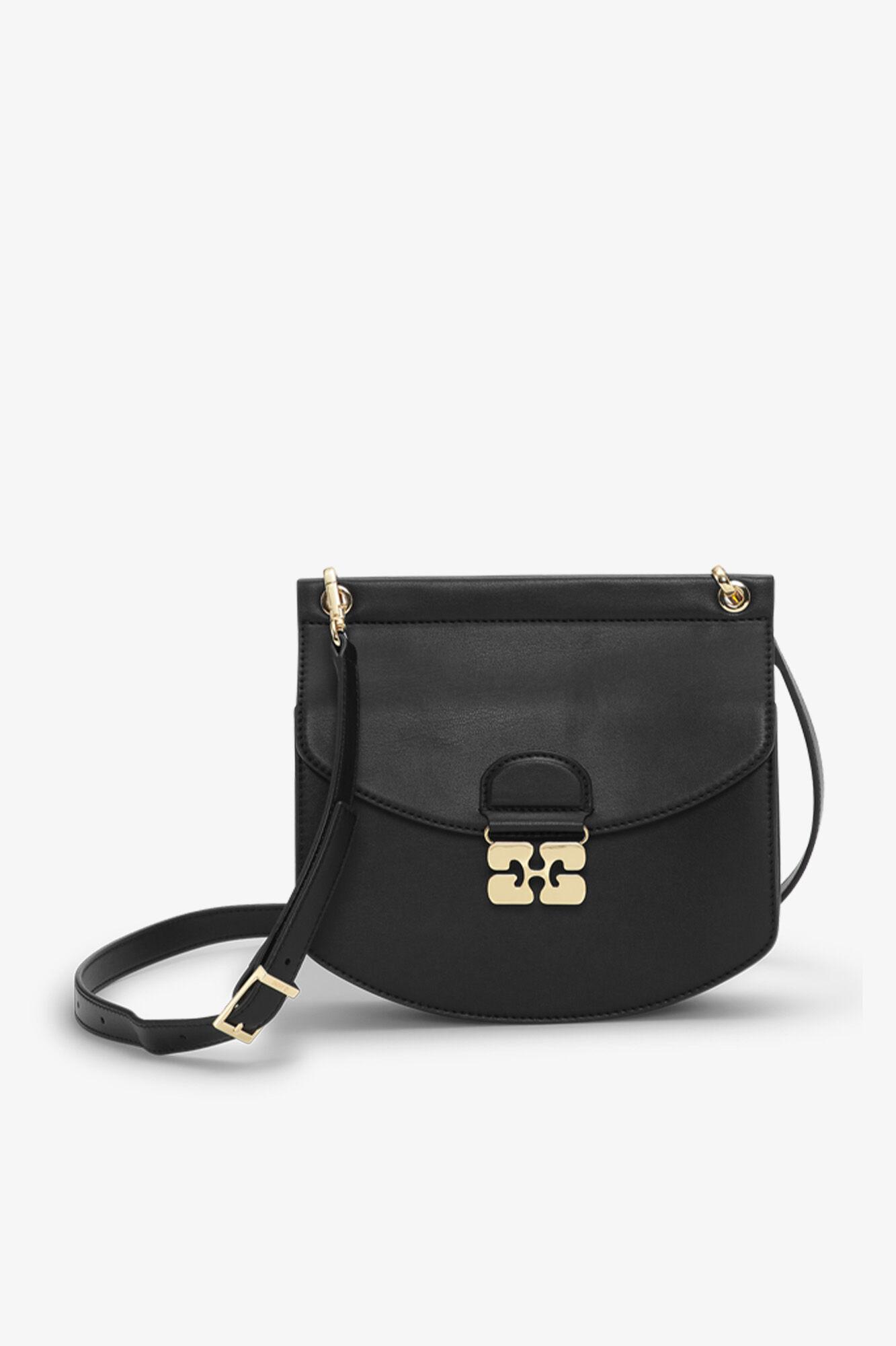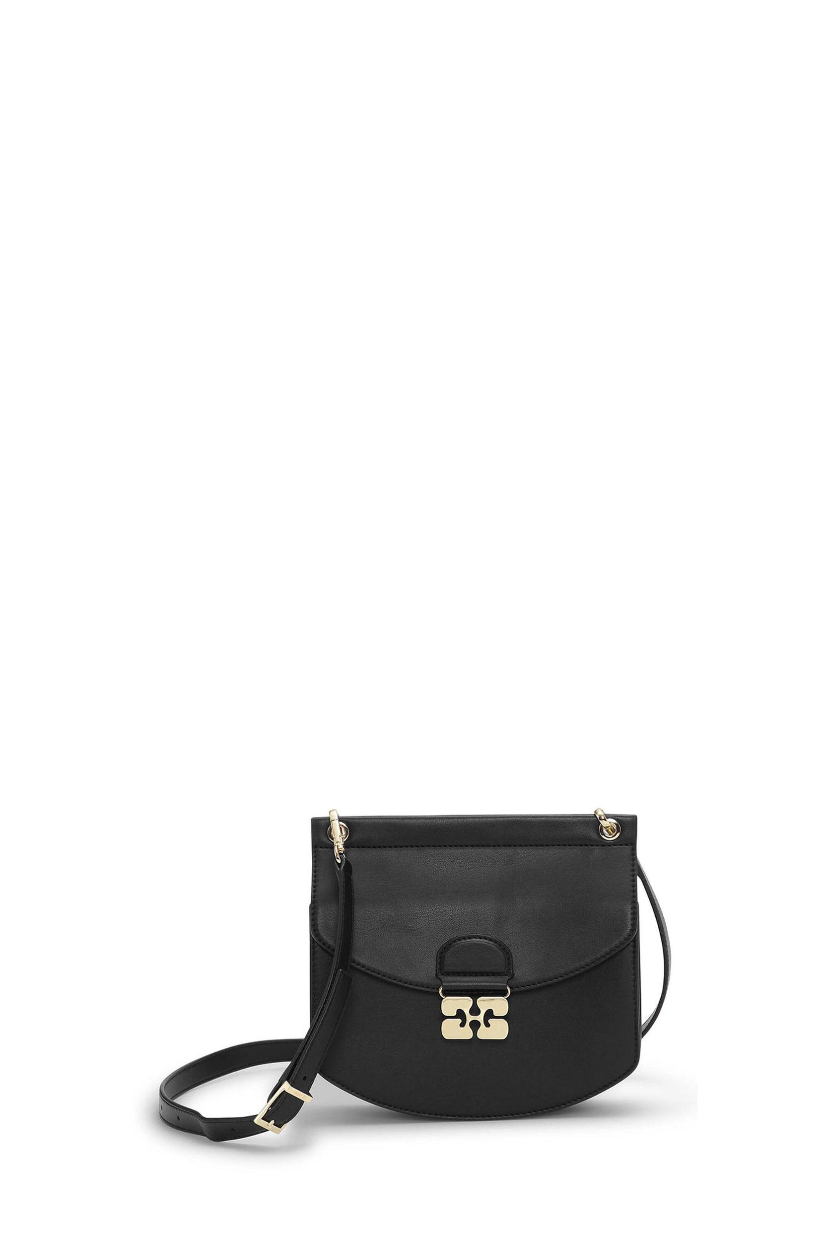 This Small Apo-G Bag comes in a black colour with a glossy finish. Crafted from recycled leather, the Apo-G features a magnetic closure with a GANNI Butterfly gold-tone clasp and a detachable strap, allowing for versatile wear as a shoulder bag or clutch. The compact interior has a slip pocket and three main compartments, one of which has a zip closure.