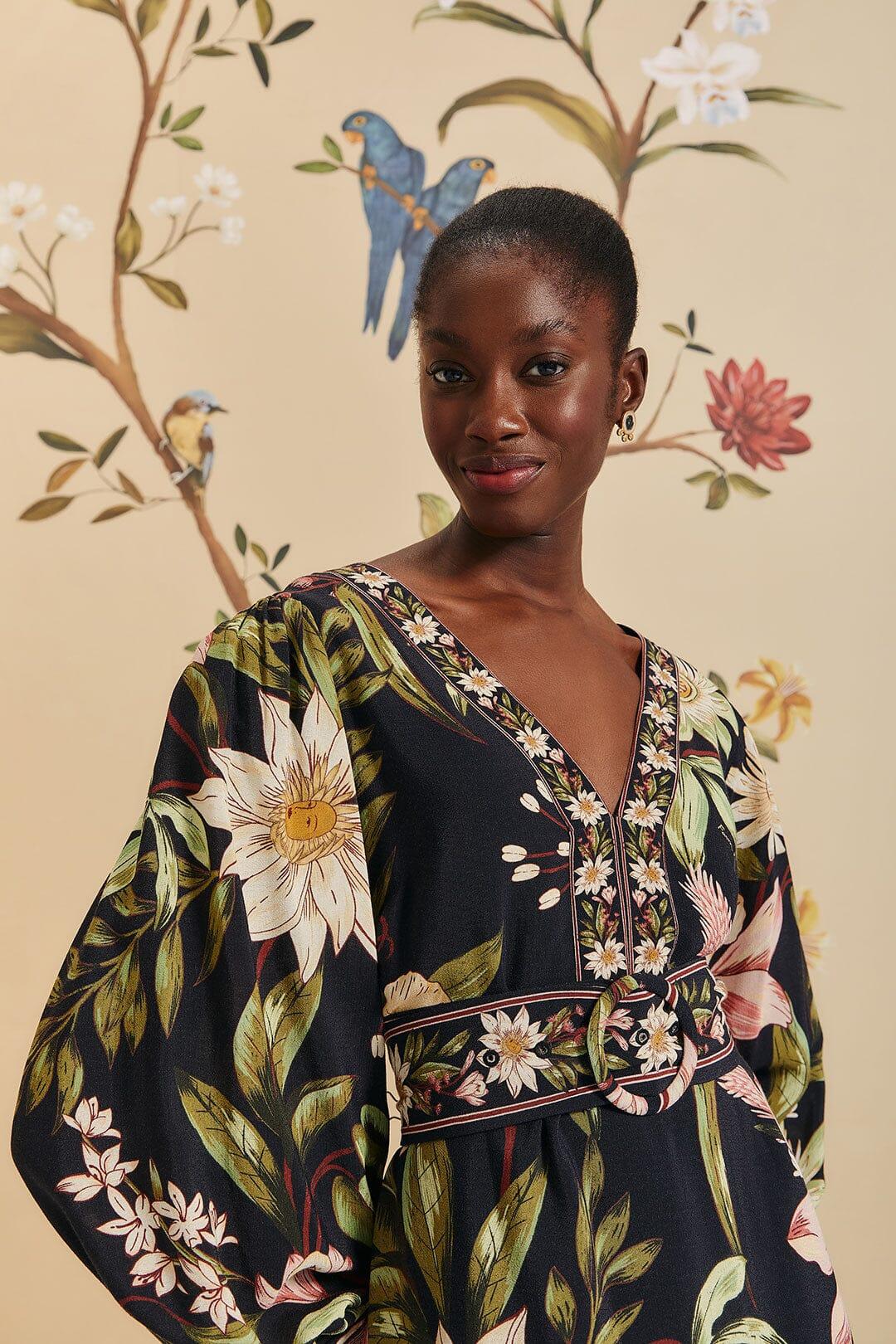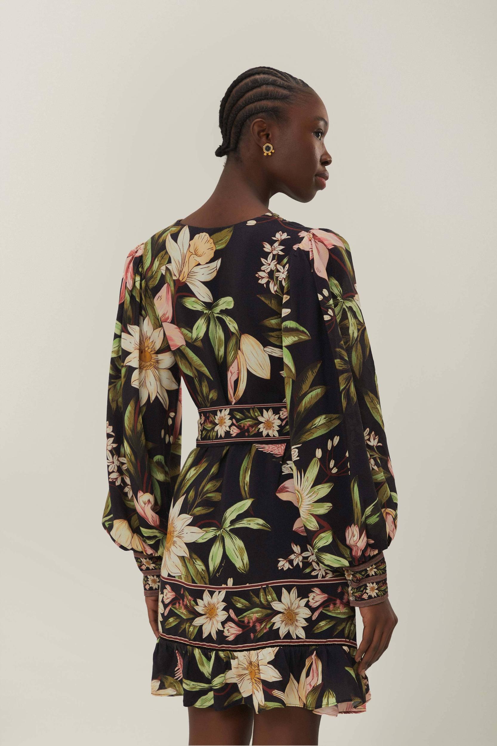 Embrace vibrant elegance with the Black Surreal Flowers Long Sleeve Mini Dress from FARM Rio. This charming piece captivates with a lush floral pattern, perfectly contrasting against a deep black canvas. The V neckline adds a touch of allure, while the puffed sleeves and playful ruffled hem enhance its whimsical silhouette. A matching floral belt cinches the waist, creating a beautifully balanced, figure-flattering look that exudes warmth and joy. Composition 100% VISCOSECare Instructions MACHINE WASH, GENTLE CYCLE, DO NOT BLEACH, DO NOT TUMBLE DRY, LINE DRYING, IRON AT MEDIUM HEAT, DRY CLEAN WITH ANY SOLVENT EXCEPT TRICHLOROETHYLENESize and Fit Inches XXS XS S M L XL Bust 31 33 35 37 40 1/4 43 1/4 Waist 28 1/4 30 1/4 32 1/4 34 1/4 37 2/4 40 2/4 Length 32 3/4 33 2/4 34 1/4 35 35 3/4 36 2/4 Hip 34 3/4 36 2/4 38 2/4 40 2/4 46 3/4 46 3/4