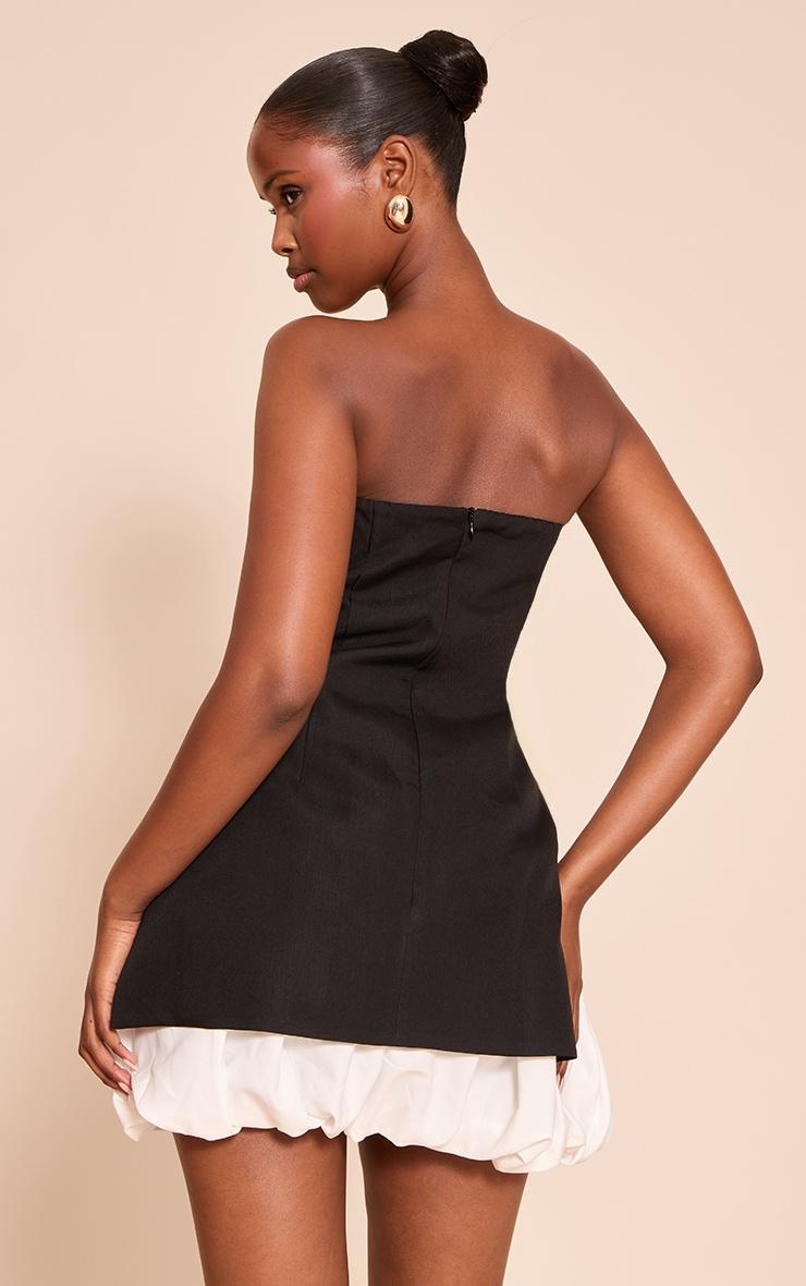 Step into sophisticated drama with the black tailored bandeau puffball hem shift dress, a piece designed to command attention. Its sleek bandeau neckline and precision-tailored bodice create a sharp top, transitioning into a clean shift profile. The distinctive puffball hem, with its contrasting white underlayer peeking through, adds an unexpected element of playful volume. Complete this striking look with sharp heeled sandals and a sleek mini bag for an assured, unforgettable entrance.Length approx 58.5cm/23inch (Based on sample size US 4)Model wears size UK 8/ EU 36/ AUS 8/ US 4Model Height - 5ft 9inchp]:!mb-4inch>Category: DressesProduct type: Shift DressColor: BlackMaterial: Tailored WovenNeckline: BandeauOccasion: Occasion