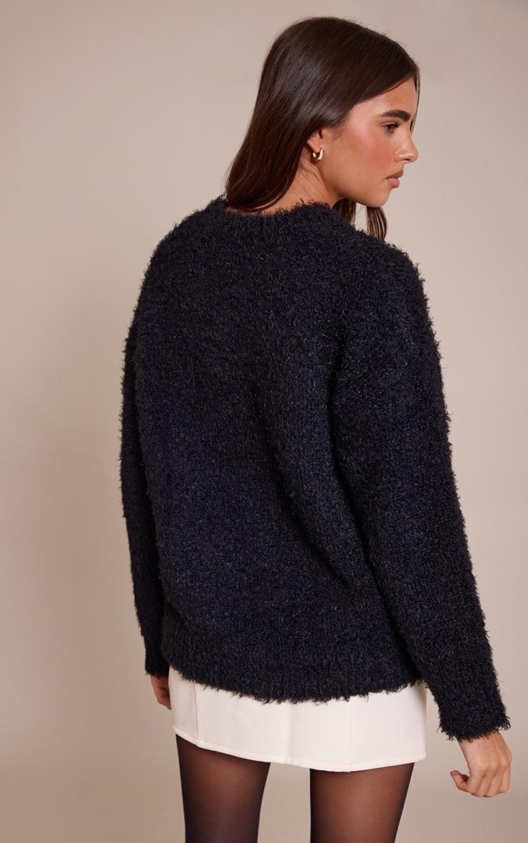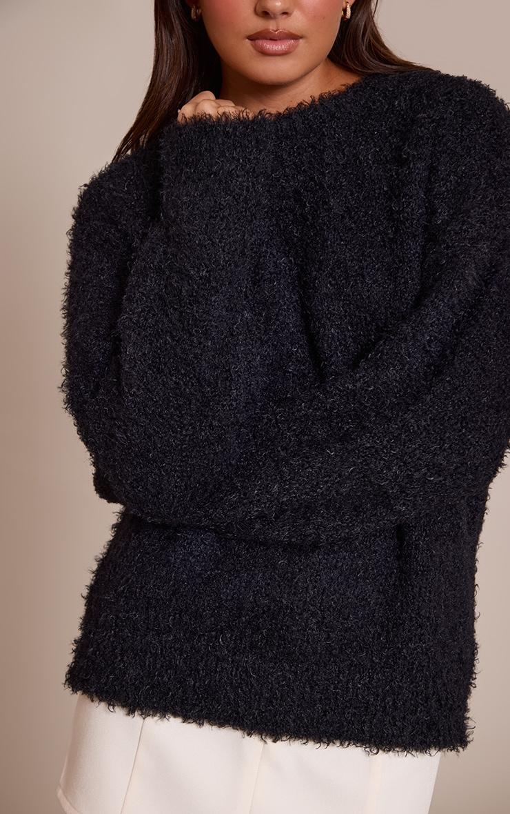 The black teddy knit oversized sweater is the definition of cozy-chic. Its plush texture and roomy fit make it perfect for layering during cooler months. Style with leather leggings or a satin skirt for a balanced mix of textures.Length approx 48.5cm/19inch (Based on sample size S)Model wears size SModel Height - 5ft 7inchp]:!mb-4inch>Category: KnitwearProduct type: SweaterColor: BlackMaterial: KnitOccasion: Day