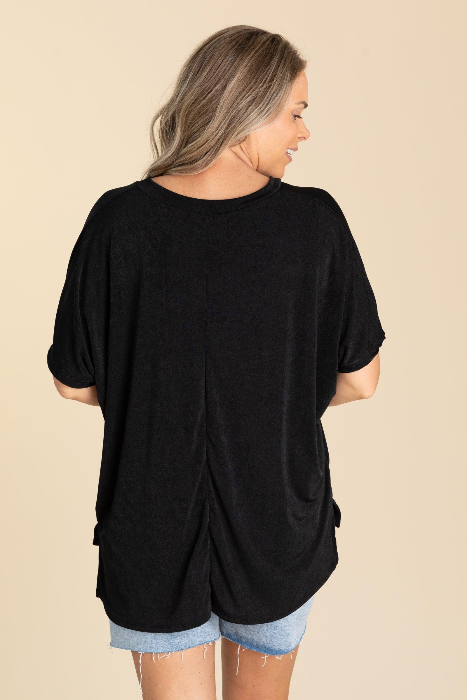 Product Details Colors: Black Print: Solid Neckline: V-Neck Sleeves: Short Sleeves Hemline: Straight Brand: Sew in Love Material and Care 95% Polyester 5% Spandex Hand Wash Cold Hang or Line Dry Size and Fit Small: Bust 58" Waist 52" Front Length 26.5" Back Length 28.5" Medium: Bust 60" Waist 54" Front Length 27" Back Length 29" Large: Bust 62" Waist 56" Front Length 27.5" Back Length 29.5" Erica is 5’7” and wearing her true size small