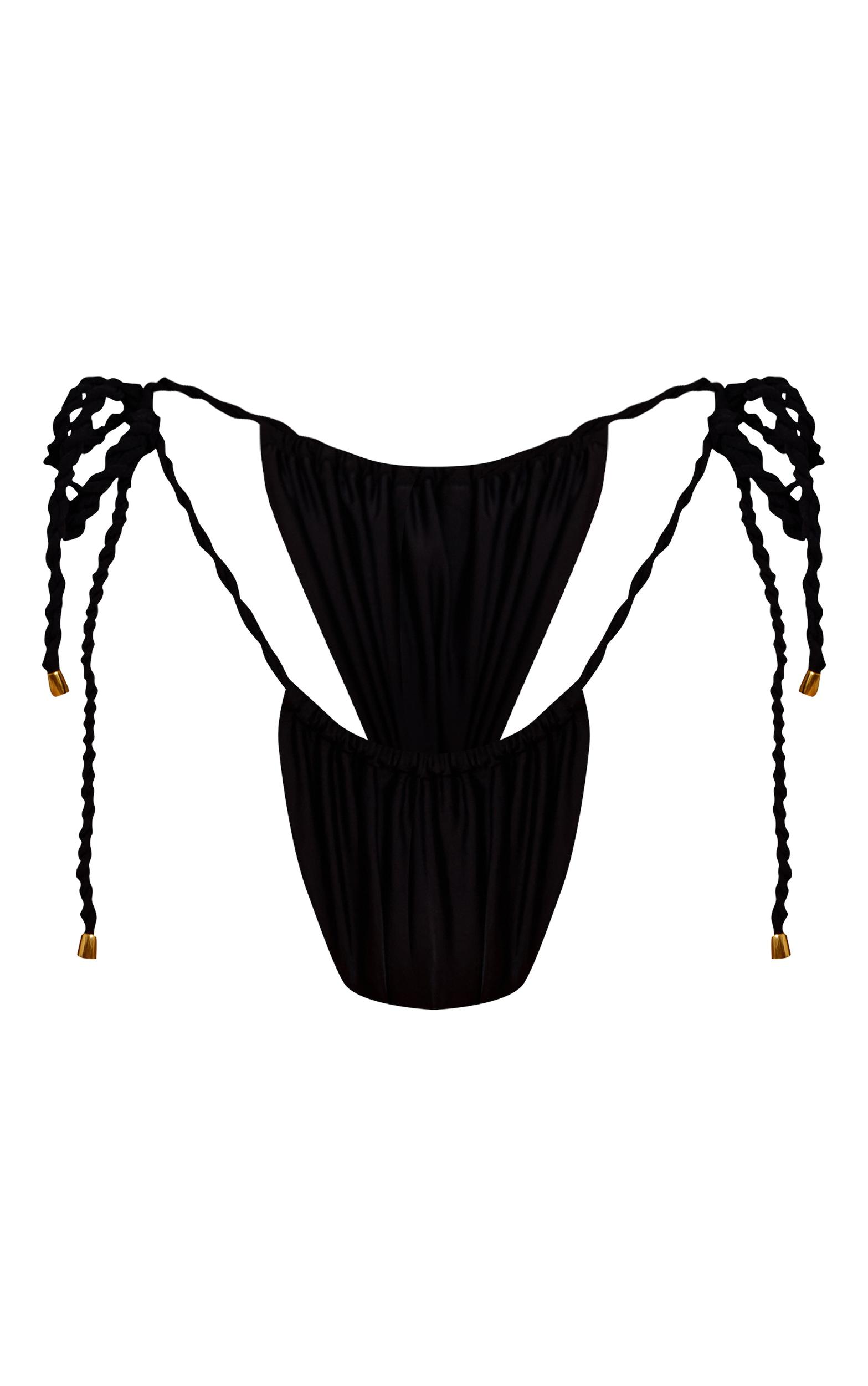 Opt for a sleek poolside look in these black tie side twist strap bikini bottoms. Crafted from black material, these bikini bottoms feature adjustable tie sides and elaborate twist straps. Pair them with the matching top and chunky sandals for a put-together look.Length approx 28cm/11inch (Based on sample size US 4)Model wears size UK 8/ EU 36/ AUS 8/ US 4Model Height - 5ft 6inchp]:!mb-4inch>Brand: PrettyLittleThingCategory: SwimwearProduct type: Tanga Bikini BottomColor: BlackMaterial: SwimOccasion: Day