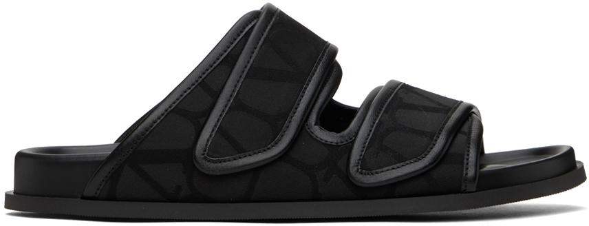 Twill sandals in black. · Jacquard logo pattern throughout · Logo stamp at molded footbed · Treaded rubber sole Supplier color: Nero