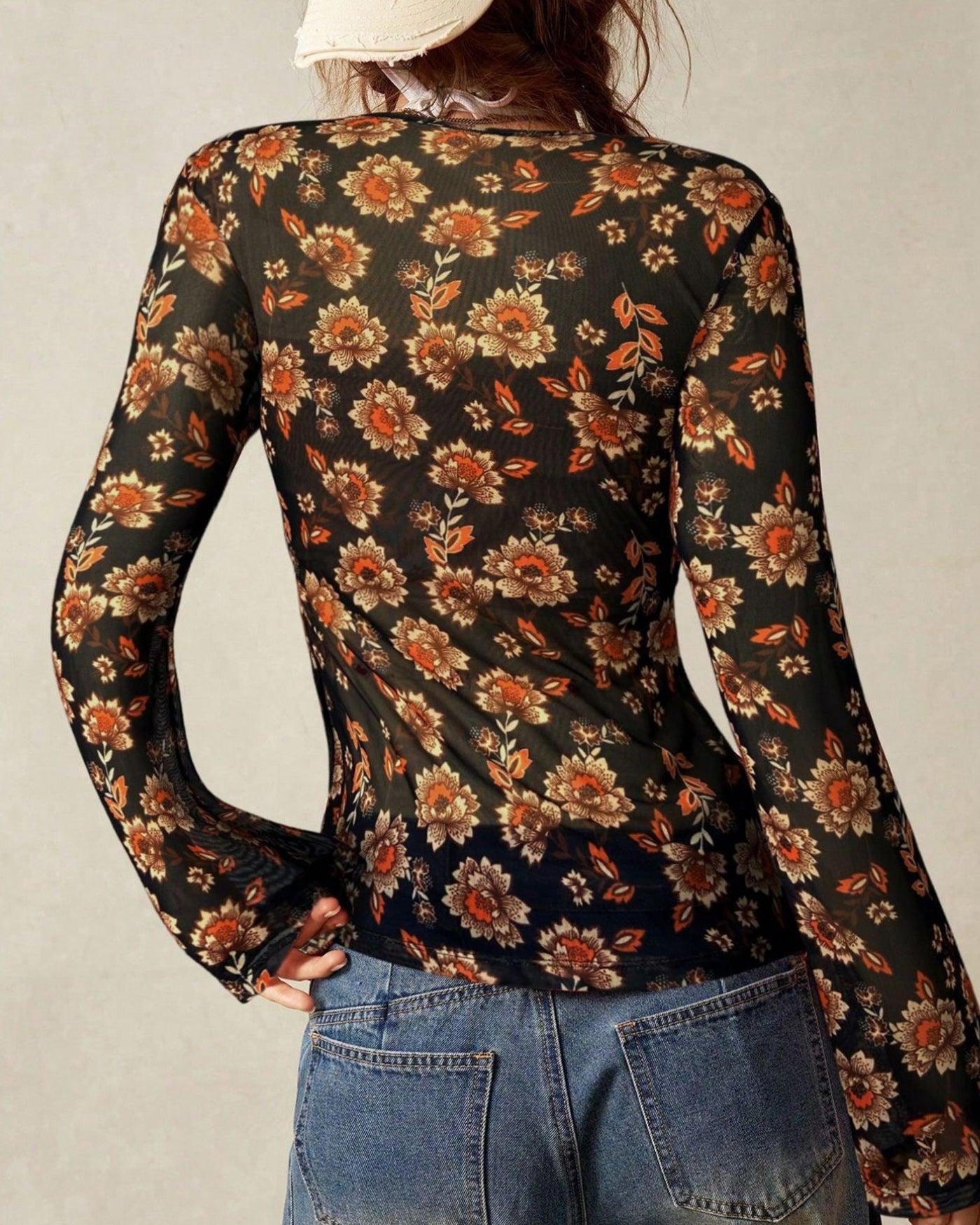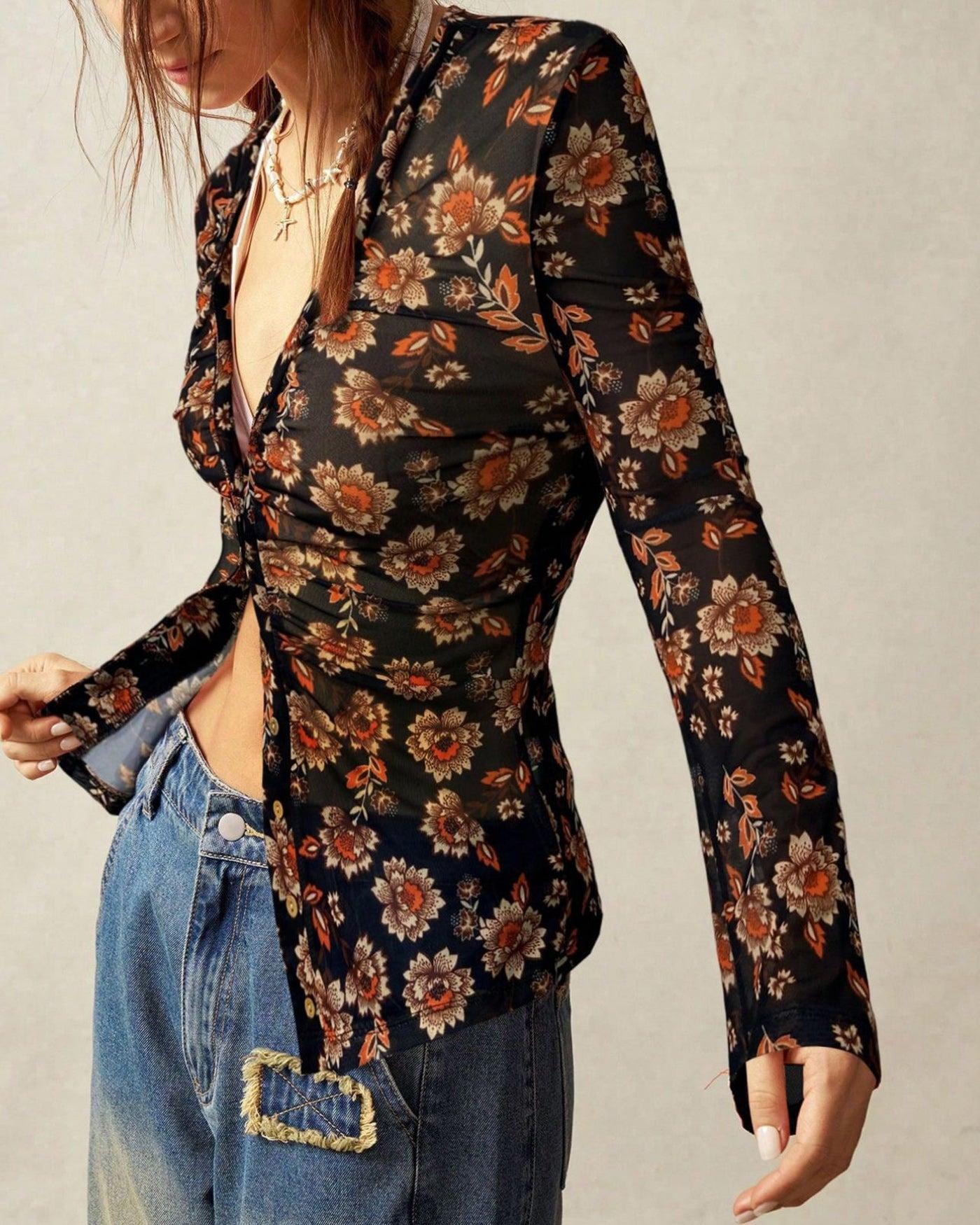 - Occasion: Daily - Style: Casual - Season: Summer, Spring - Fabric Stretch: High Stretch - Sleeve Length: Long Sleeves - Sleeve Type: Regular Sleeve - Pattern Type: Floral - Embellishment: Button, Pleated - Neckline: V Neck - Fit: Slim - Fabric: Polyester 95.0%, Spandex(Elastane) 5.0% - Material: Knit
