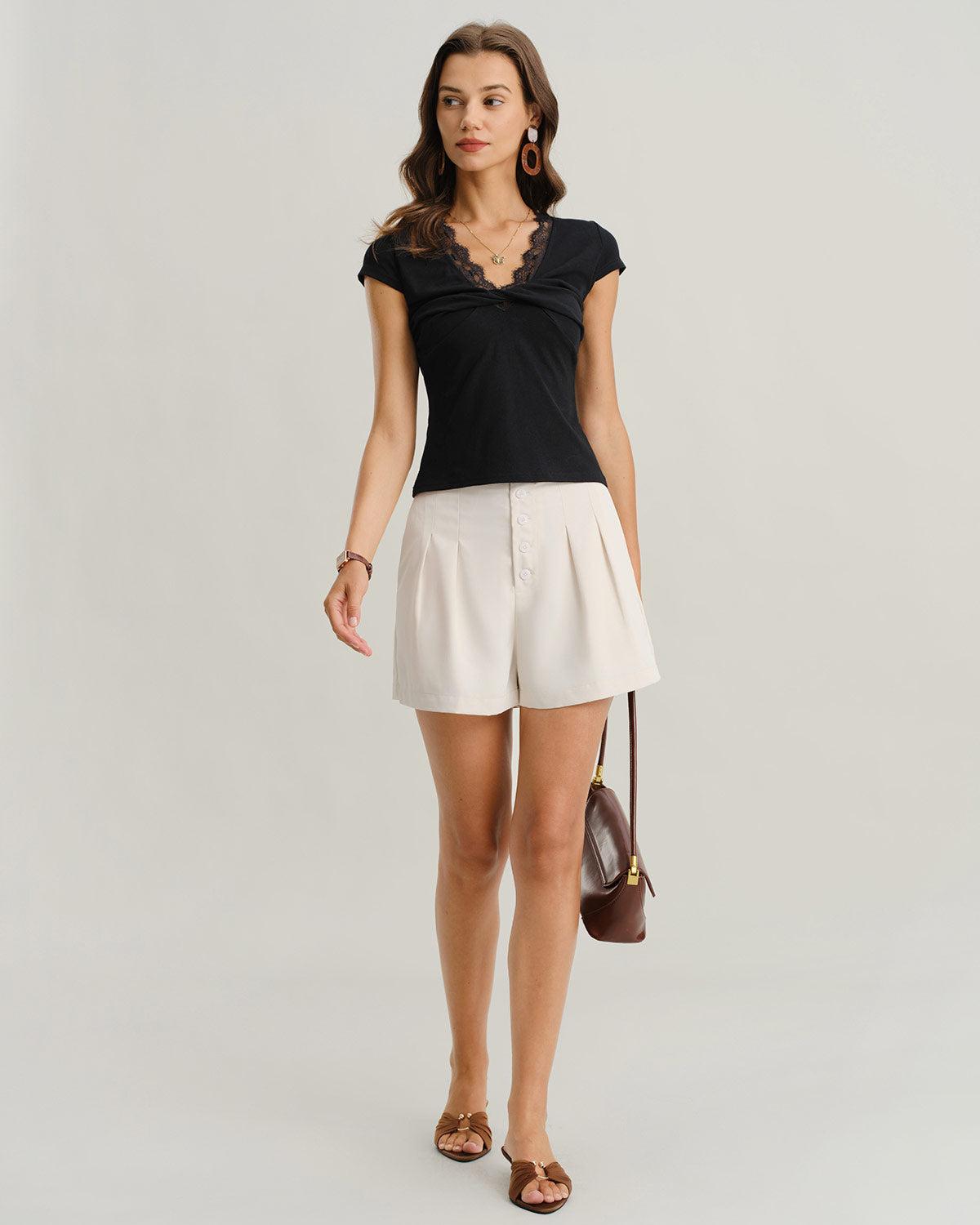- Occasion: Daily - Style: Casual - Fabric Stretch: Medium Stretch - Sleeve Length: Short Sleeves - Sleeve Type: Regular Sleeve - Pattern Type: Solid - Embellishment: Twist, Lace - Neckline: V Neck - Fit: Slim - Fabric: Spandex 8.0%, Viscose 92.0% - Material: Knit