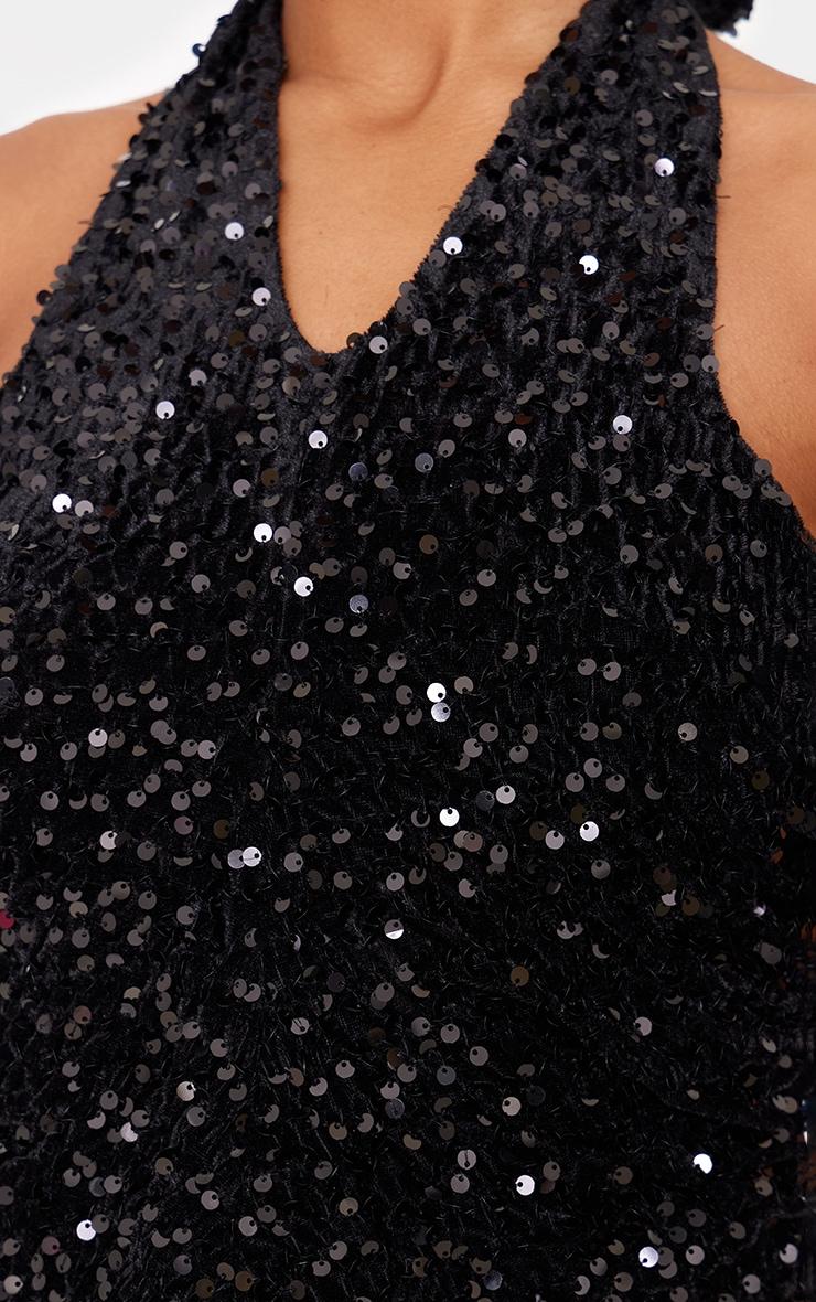 Make weekend styling easy by bagging this black velvet sequin halterneck long top. Brought to you in a chic black shade, with a luxe velvet material and statement sequin design, what's not to love? Style with a black mini skirt and tights for the ultimate finish we're loving. Length approx 38cm/15inch (Based on a sample size UK 8) Model wears size UK 8/ EU 36/ AUS 8/ US 4Model Height - 5ft 6inchp]:!mb-0inch>Category: TopsProduct type: Vest TopColor: BlackMaterial: VelvetDesign: PlainNeckline: HalterneckSleeves: SleevelessOccasion: Evening
