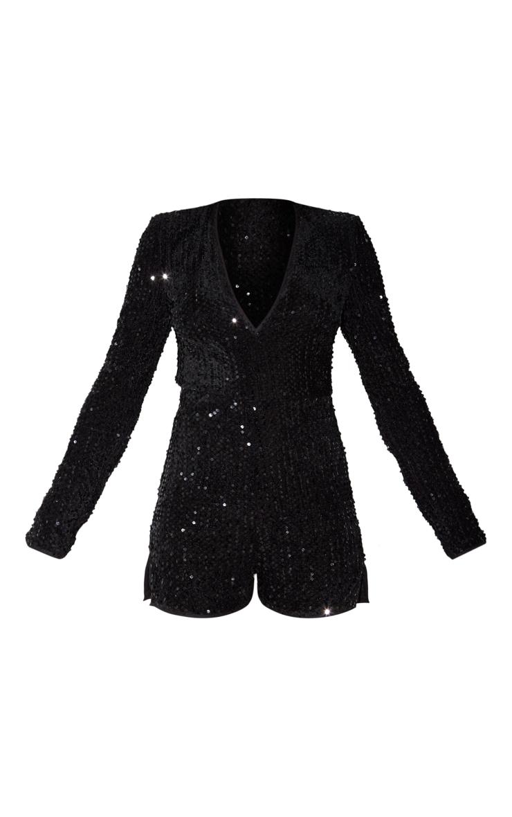 Dance the night away with this romper doll. Featuring a black velvet sequin material with a plunging neckline and split hem, we're obsessed. Team it with diamante heels for a dreamy look that is sure to get you noticed. Length approx 79cm/31inch (Based on a sample size UK 8) Model wears size UK 8/ EU 36/ AUS 8/ US 4 Model Height - 5ft 9inch Model Height - 5ft 9inchp]:!mb-4inch>Category: DressesProduct type: UnitardColor: BlackMaterial: SequinDesign: PlainNeckline: PlungeSleeves: LongOccasion: Evening