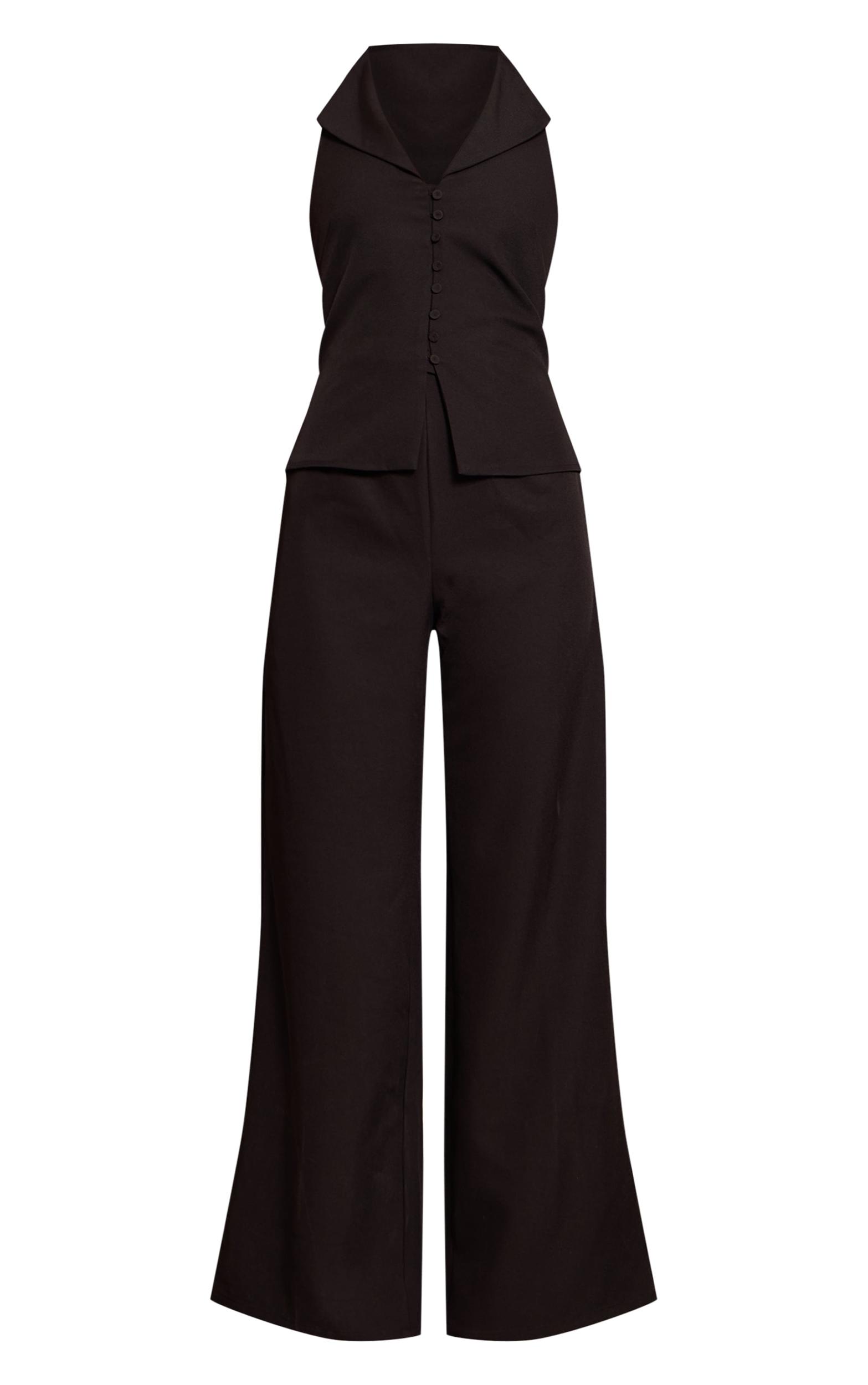 Bring sleek tailoring to your wardrobe with this black vest straight leg jumpsuit. Featuring a vest-style top with button-down detailing, a cinched waist, and a streamlined straight leg fit, this piece is all about understated elegance. Perfect for dressing up or down, style with strappy heels and a bold red lip for evening glam, or layer with an oversized blazer and loafers for chic daytime tailoring.Length approx 155cm/61inch (Based on sample size US 4)Model wears size UK 8/ EU 36/ AUS 8/ US 4Model Height - 5ft 9inchp]:!mb-4inch>Category: DressesProduct type: Wide Leg JumpsuitColor: BlackMaterial: Tailored WovenOccasion: Evening