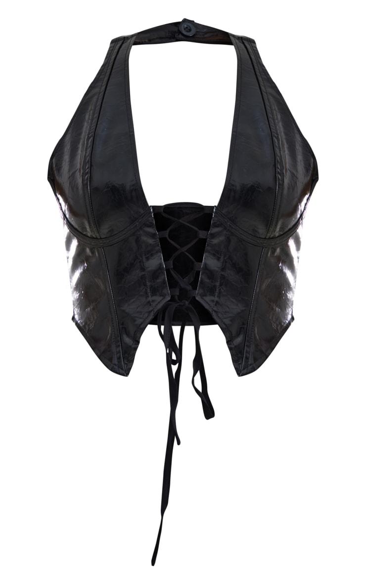 Consider this your new-season style investment. Crafted from a subtly textured, washed faux leather, this black halterneck top introduces a directional edge to your wardrobe. The lace-up front allows for a customisable plunge, adding a touch of considered detail. Let the piece command attention by pairing it with tailored pants from our bottoms collection for a confident evening aesthetic. Length approx 38cm/15inch (Based on a sample size UK 8) Model wears size UK 8/ EU 36/ AUS 8/ US 4Model Height - 5ft 7inchp]:!mb-4inch>Brand: PrettyLittleThingCategory: TopsProduct type: CorsetColor: BlackMaterial: Faux LeatherDesign: PlainNeckline: HalterneckSleeves: SleevelessOccasion: Evening