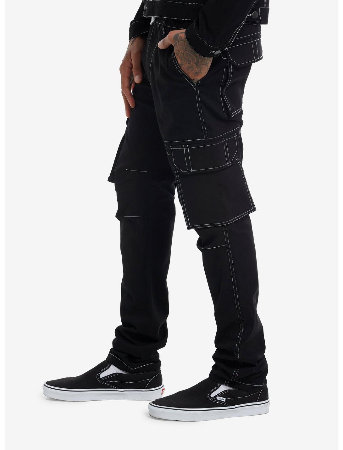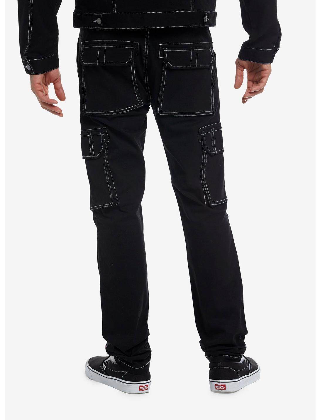 Stay cozy and stylish in these black cargo pants! Featuring white contrast stitching throughout for extra dimension. They have a slim fit and feature hip, back and cargo pockets.Please note: Style is fitted with no stretch; size up for a looser fit.63% cotton; 33% polyester; 2% rayon; 2% spandexWash cold; dry lowRise: 12''Inseam: 30''ImportedListed in men's/unisex sizesModel is 6'1''Model wears size Medium