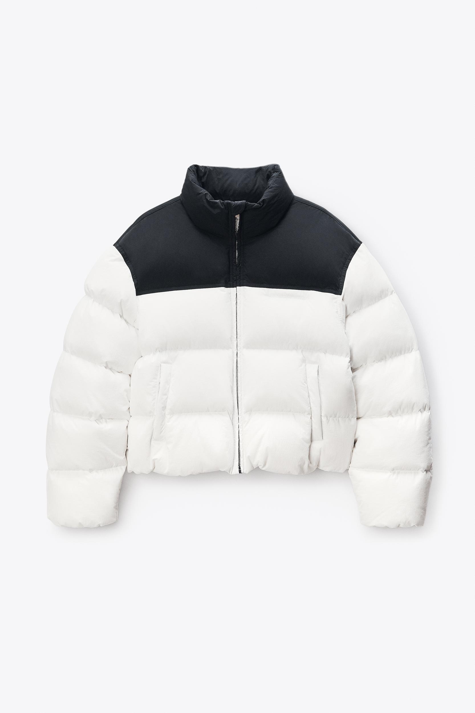 cut from black and white matte nylon, this cropped puffer jacket features a stand collar, dropped shoulders, and a zip-front closure with a bungee cord hem. snap welt pockets, tonal logo embroidery, and a contrast yoke panel complete the look.
