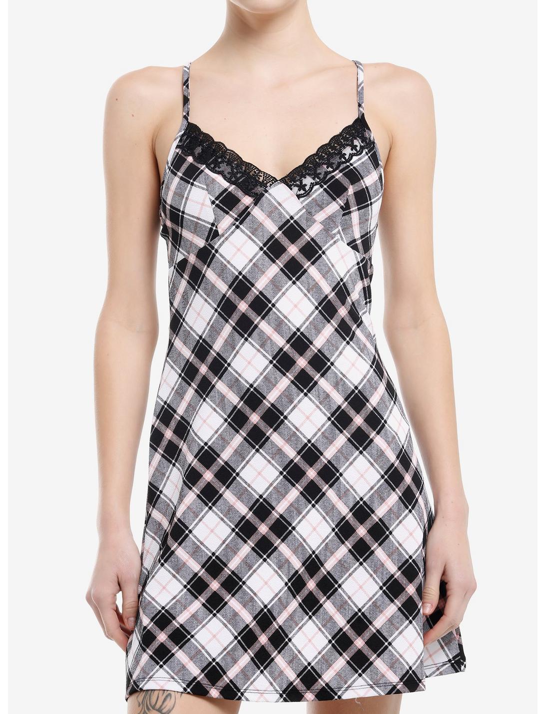 Throw some plaid into your mini dress mix with this style! It is a black, white and pastel pink plaid with black lace trim at the bust and adjustable straps.95% polyester; 5% spandexWash cold; dry lowLength: 32"ImportedListed in junior sizesModel is 5'10"Model wears size Small