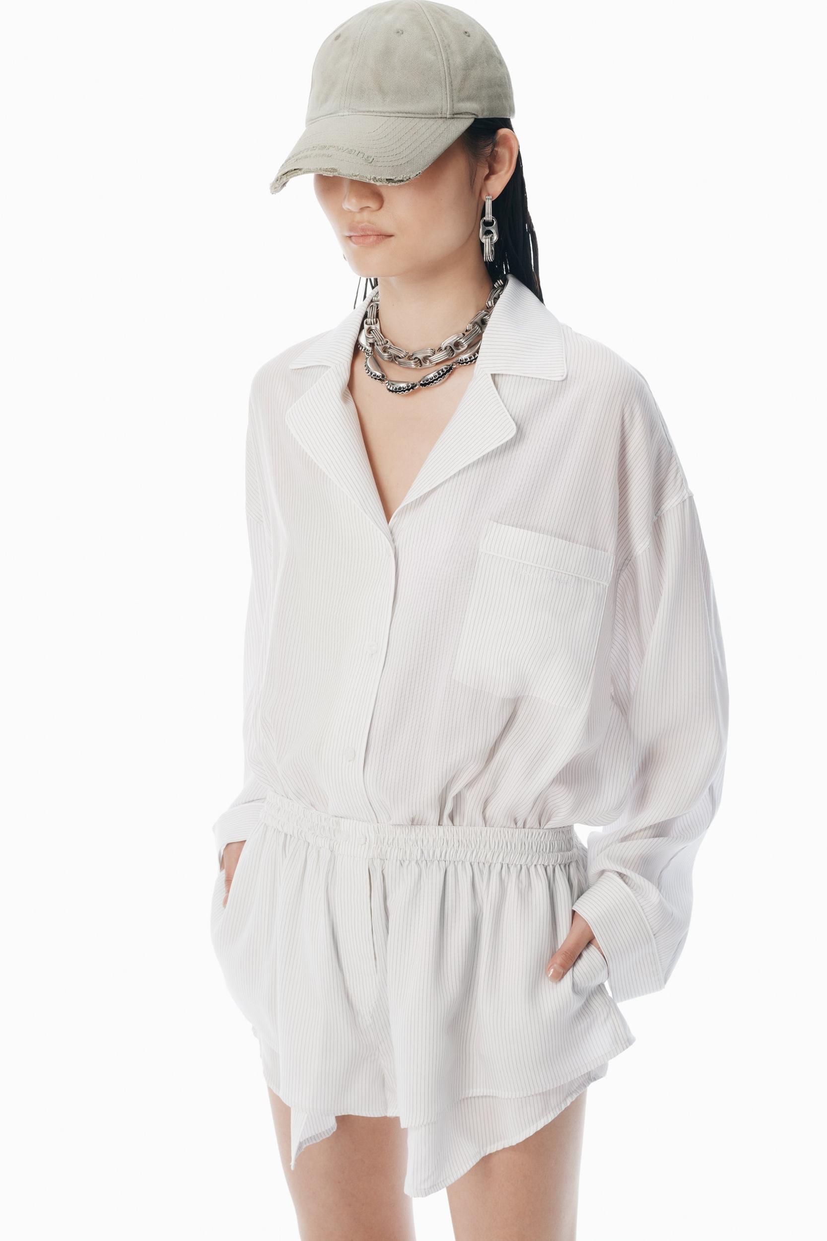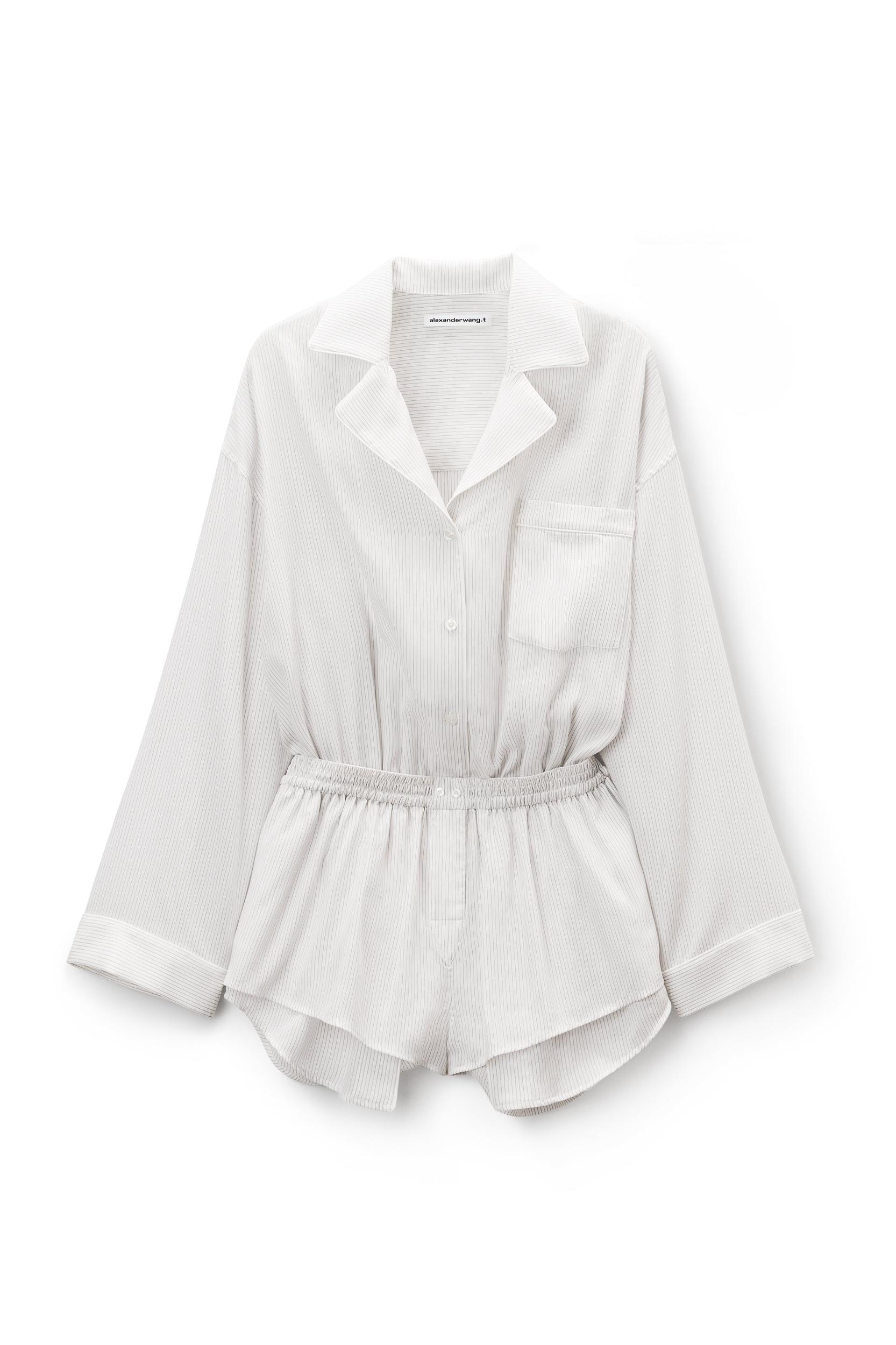 This black and white pre-styled pajama romper with boxer shorts features a notched collar, a logo-detailed chest pocket, and a button-front closure.