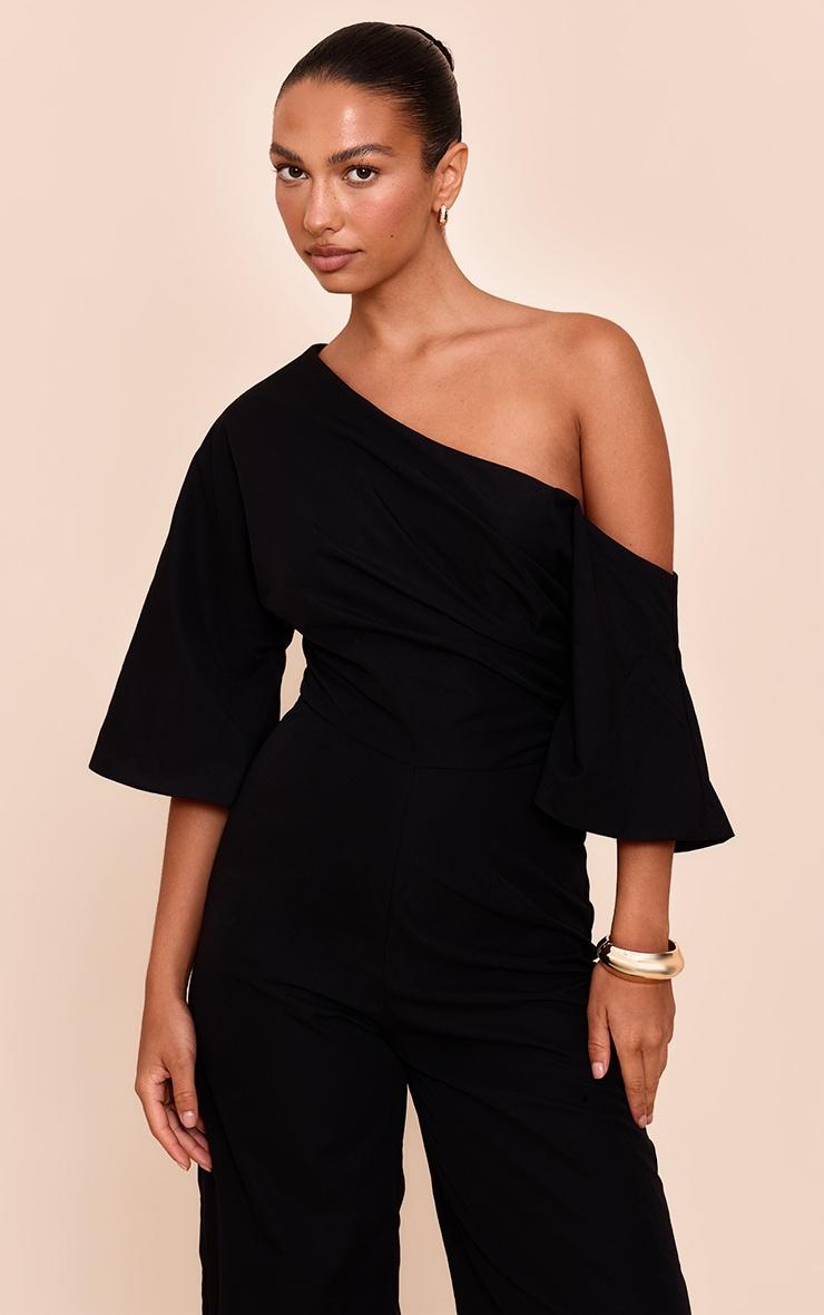 Command attention with this refined piece, the black woven asymmetric short sleeve wide leg jumpsuit. Its striking asymmetric neckline and single, wide-cut short sleeve create a sophisticated, modern edge. The artfully draped bodice cinches at the waist, leading into elegant wide-leg pants that offer an effortlessly flattering silhouette. Style this jumpsuit with sharp square-toe heeled mules and a bold gold cuff bracelet for an undeniably chic evening ensemble that commands every room.Length approx 155cm/61inch (Based on sample size US 4)Model wears size UK 8/ EU 36/ AUS 8/ US 4Model Height - 5ft 7inchp]:!mb-4inch>Brand: PrettyLittleThingCategory: DressesProduct type: Wide Leg JumpsuitColor: BlackMaterial: Woven CrepeNeckline: AsymmetricSleeves: ShortOccasion: Evening