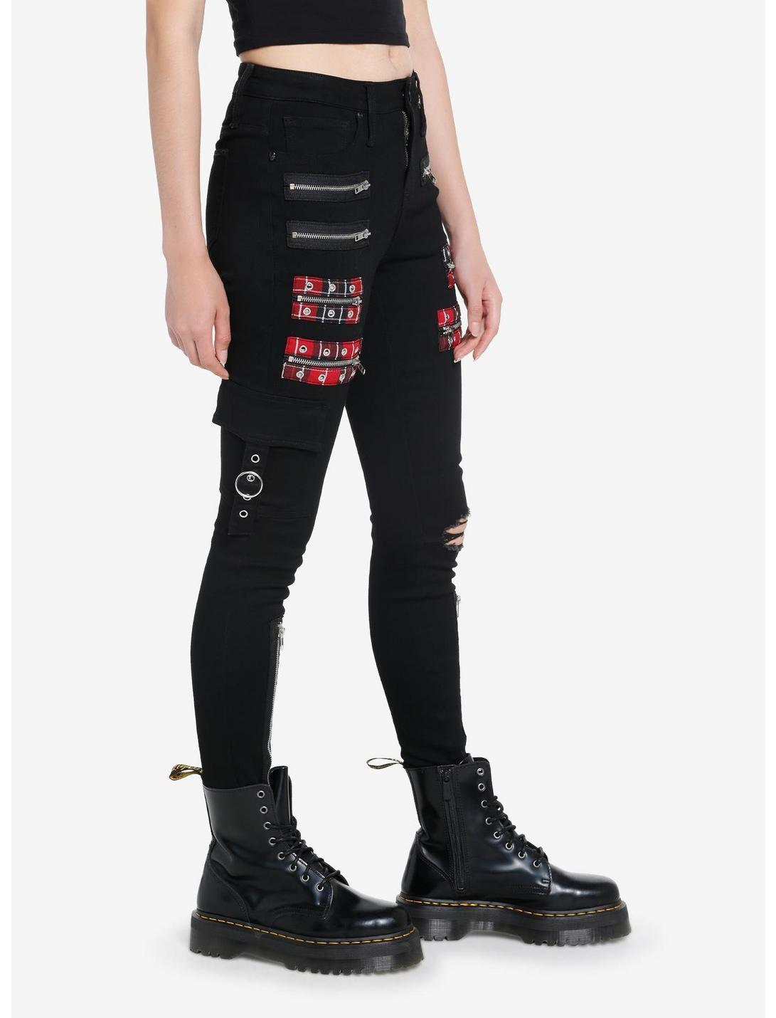 Keep the punk look alive in these super skinny jeans! Featuring red plaid patches with zipper detailing on the thigh and down the shin. Comes with destruction on the knee, grommet strap detailing and classic 5-pocket styling.70% cotton; 27% polyester; 3% spandexHand wash cold; dry flatStretchy materialRise: 10''Inseam: 28''ImportedListed in junior sizes