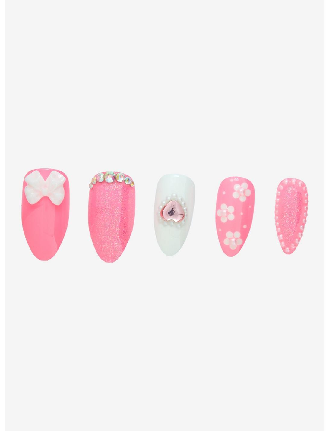 Blossom into spring with the cutest mani! This press-on nail set features pink and white nail with flower designs, plus rhinestone, faux pearl and bow charms. Comes with 24 nails, 1 tube of nail glue, an applicator, nail file and a manicure stick.24 nailsABS plastic2g glue, applicator, nail file and manicure stick includedImported