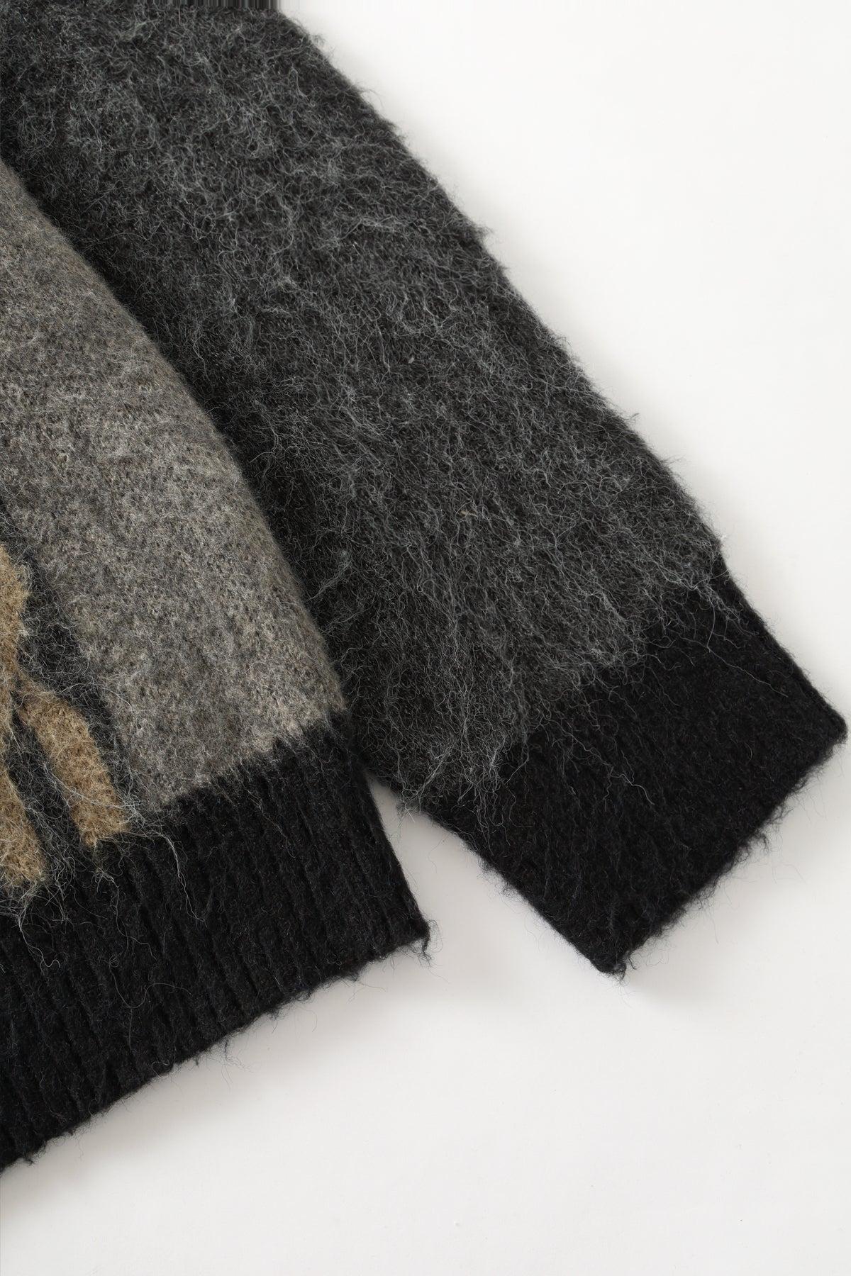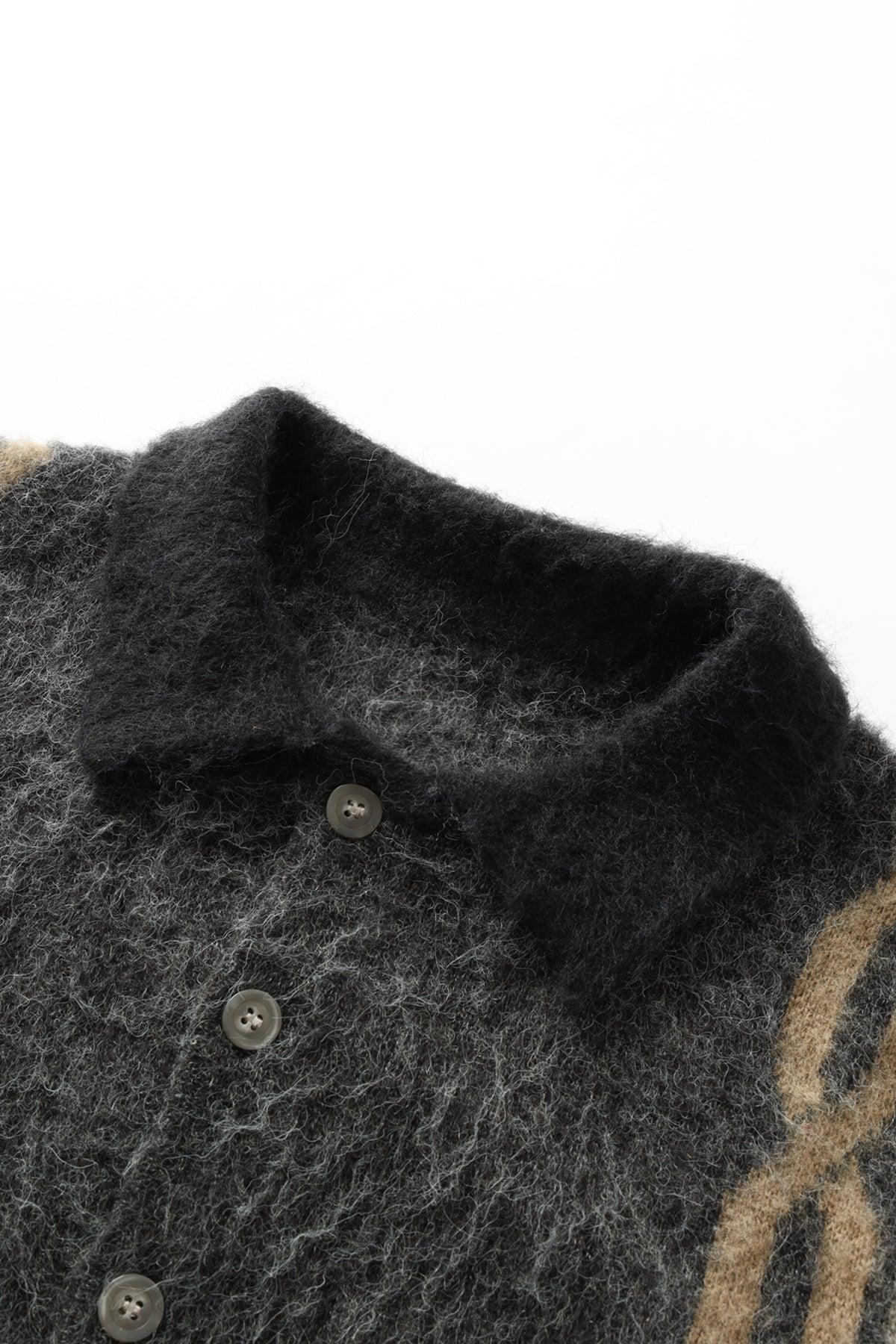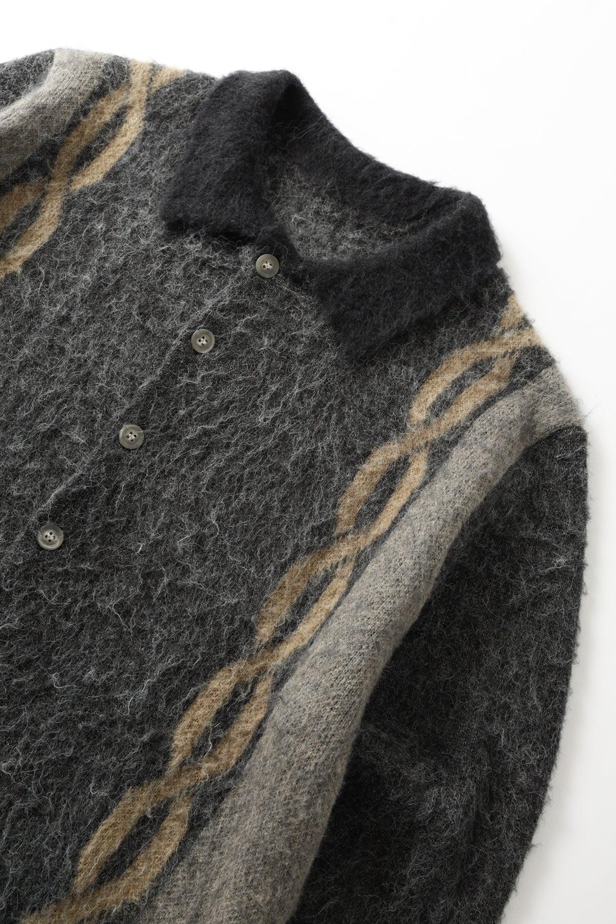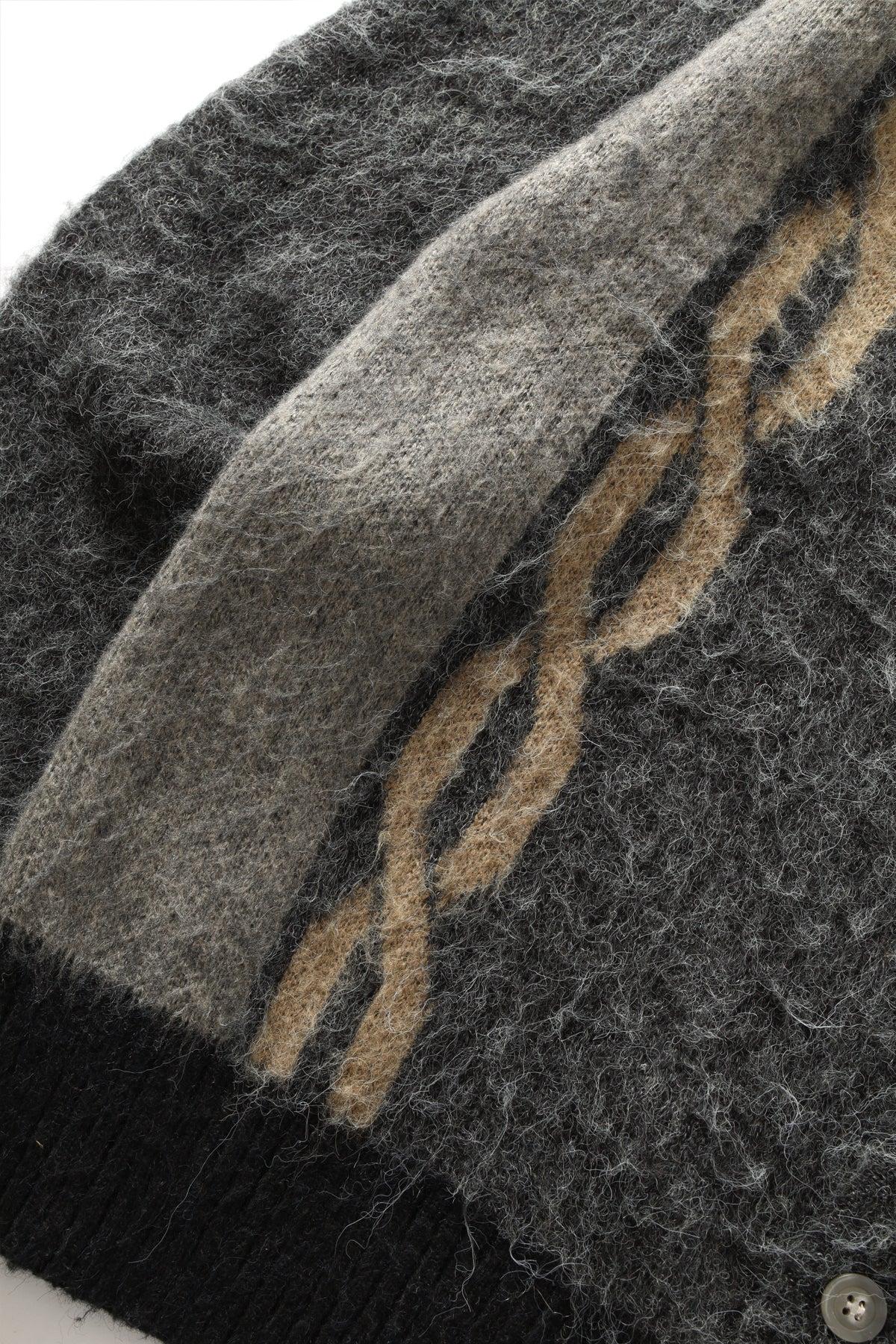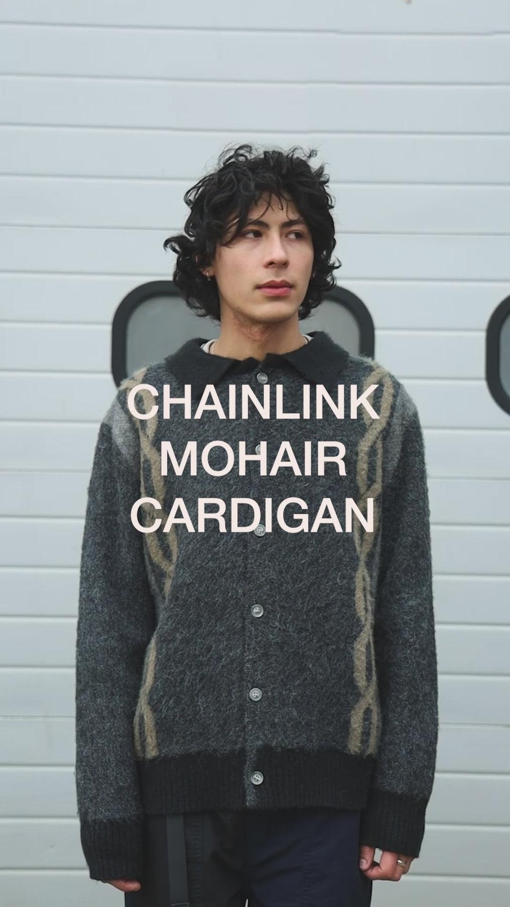 Chainlink mohair cardigan, heavyweight 7GG knit, ribbed cuffs and waistband, chainlink jacquard detail, 8% Mohair 15% Wool 22% Nylon 55% Acrylic
