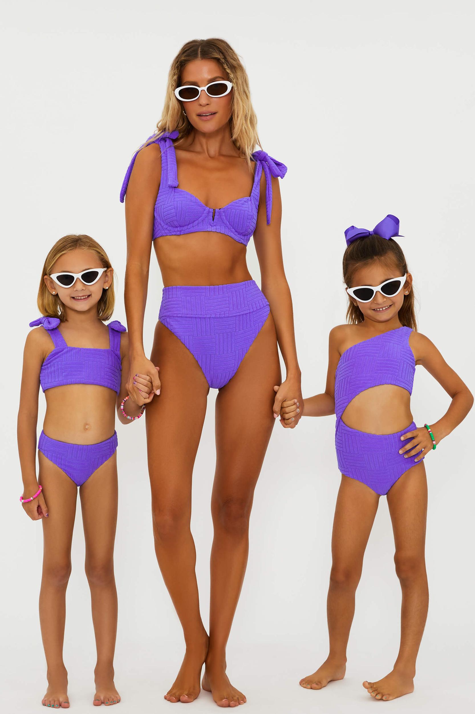 Our best-selling Blair Top is now available in Ultra Violet terry fabric. This best-selling towel terry jacquard fabric is lightweight, breathable, soft to the touch, and anti-pill. With a sweetheart neckline with a notched center detail, self-tie shoulders, built-in underwire and a mid-back clasp. 96% POLYESTER 4% SPANDEX Model is wearing size small