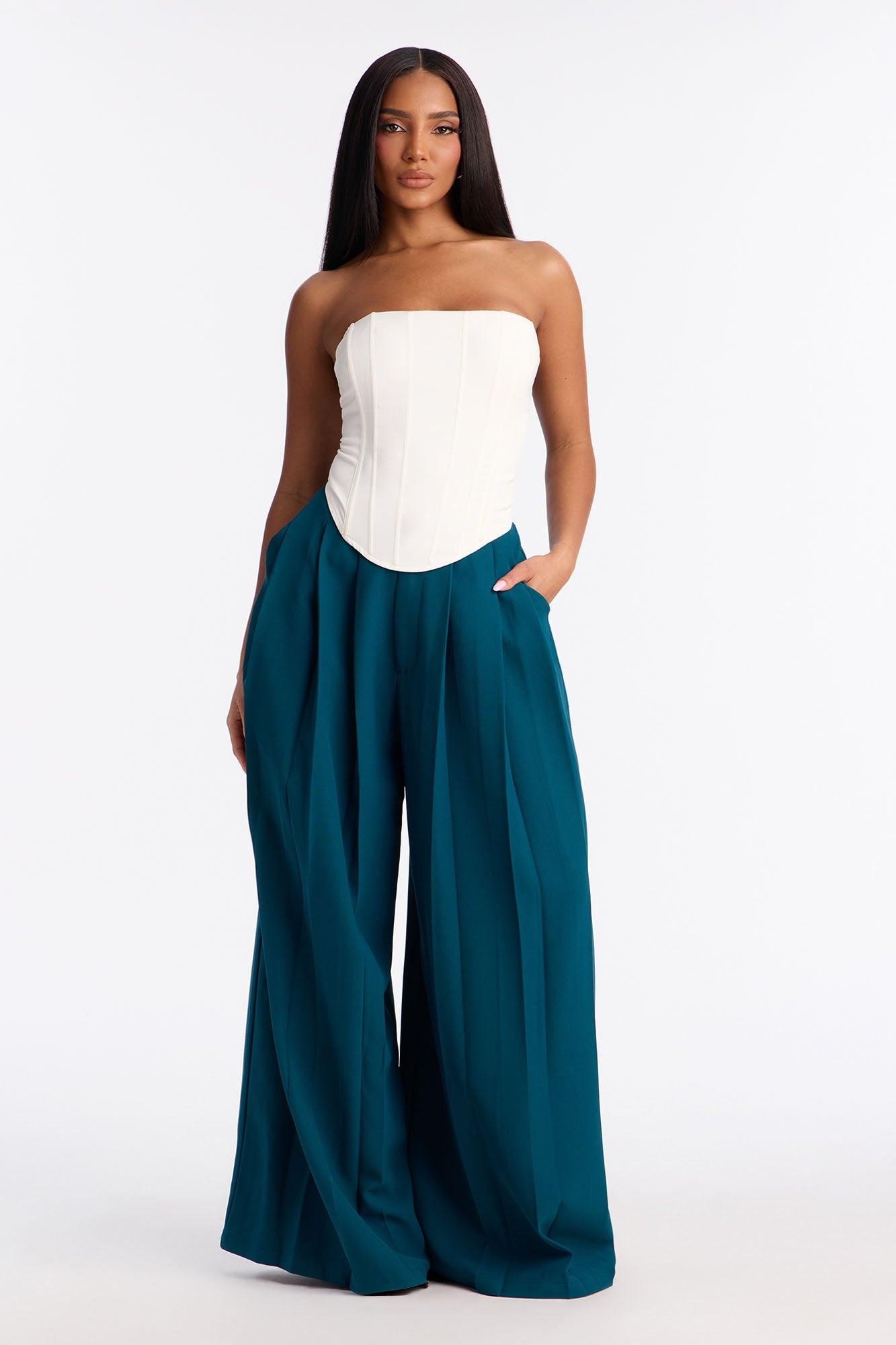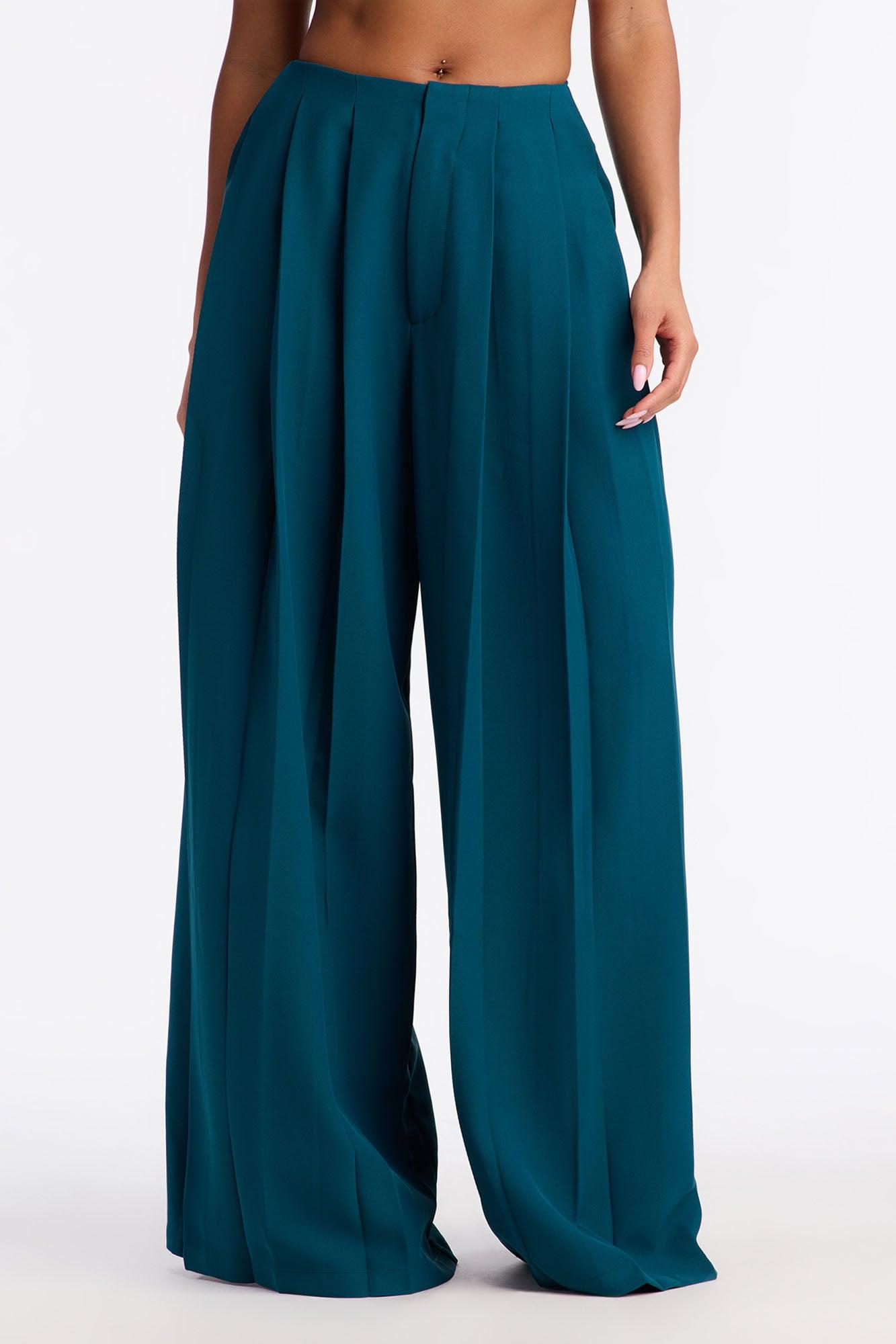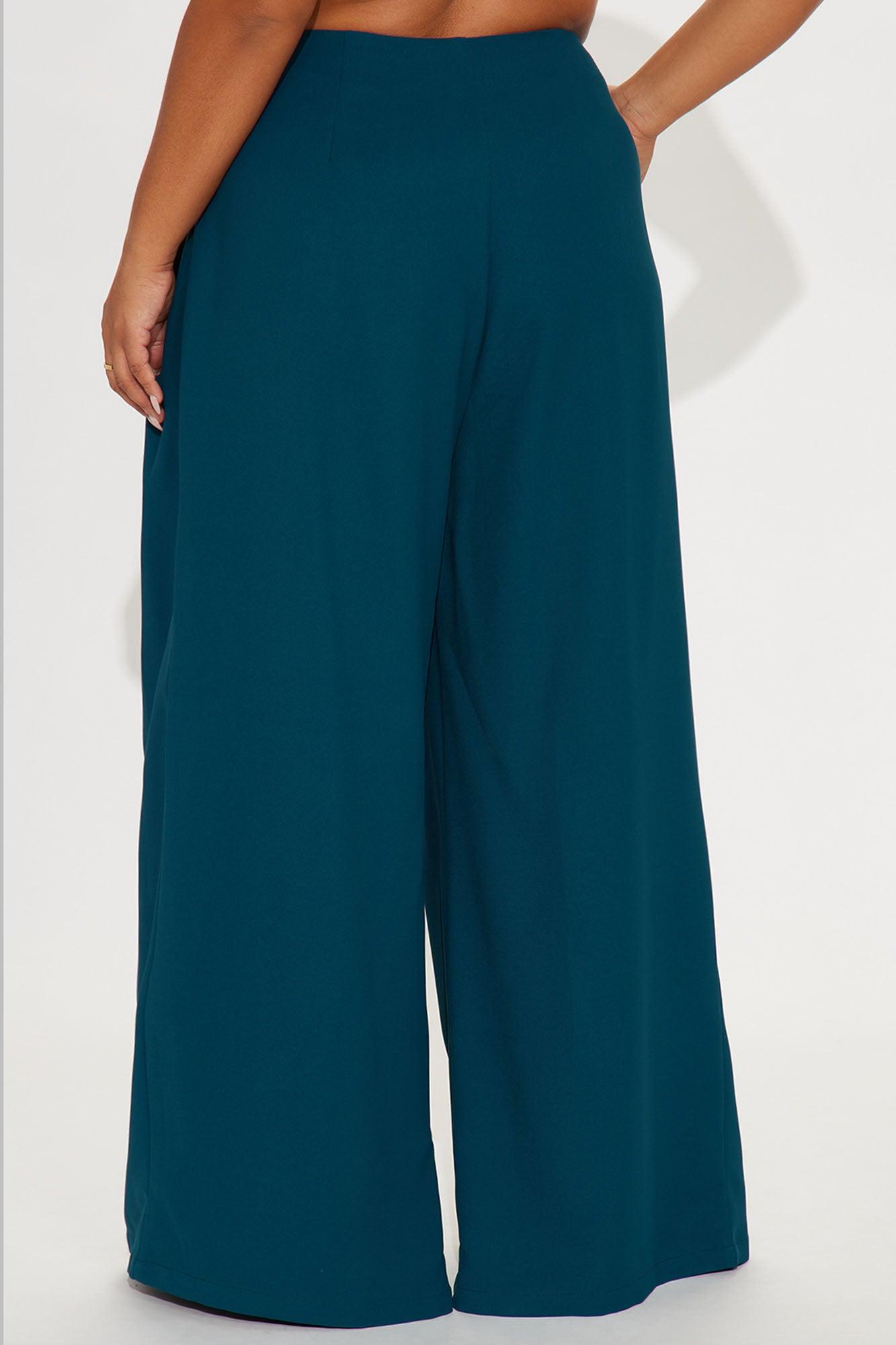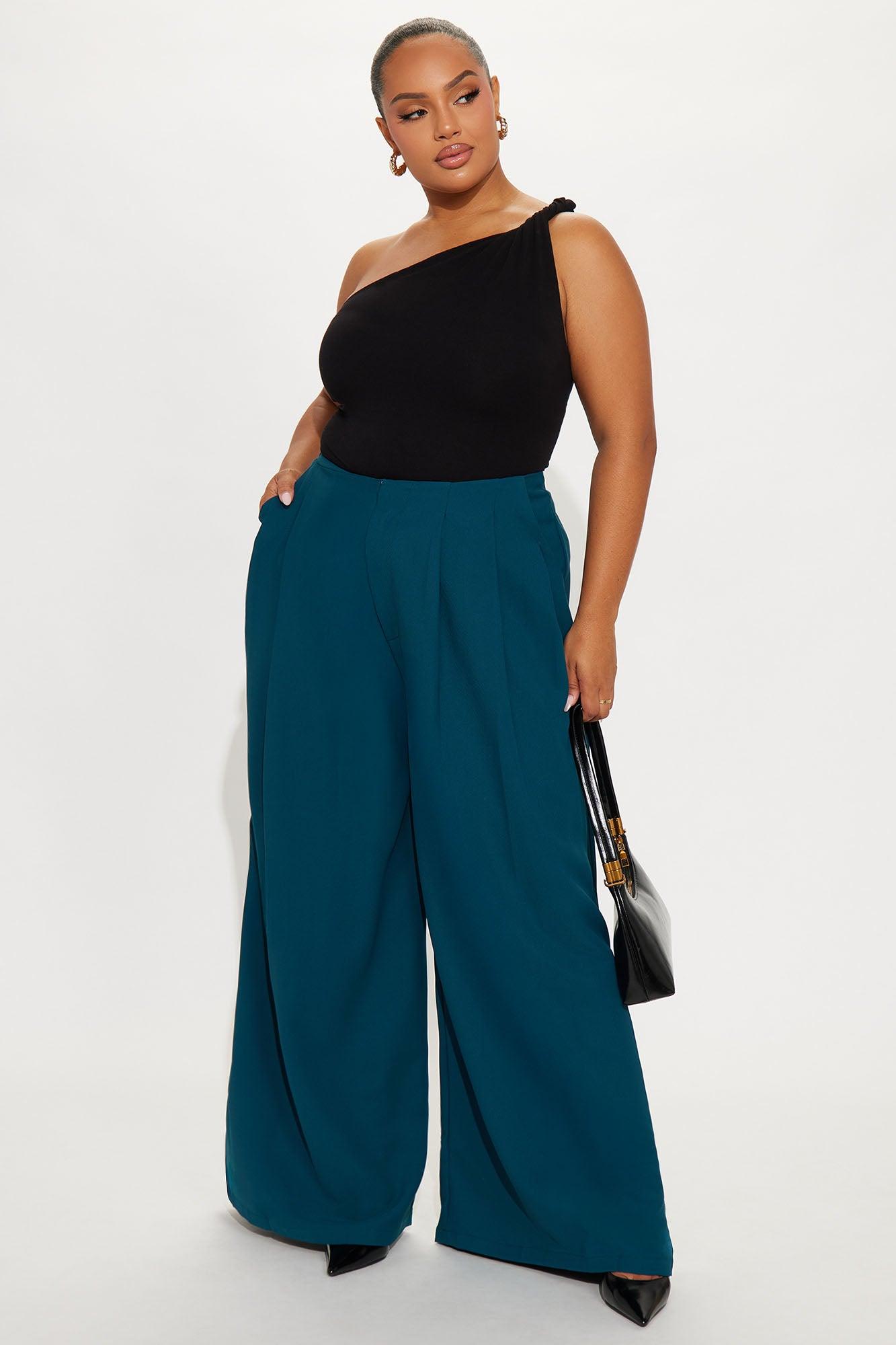 Available In Black, Grey, Olive And Teal. Trouser Pant Mid Rise Hook & Eye Closure Pleated Front Wide Leg Full Lining 32" Inseam Self: 100% Polyester Imported California Proposition 65WARNING: Cancer and Reproductive Harm - www.P65Warnings.ca.gov.