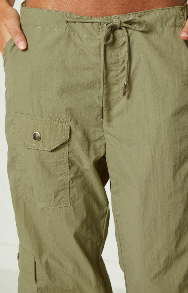 Khaki Parachute Pants The parachute pants of your Y2K dreams! The lightweight material is perfect for the summer months where you still want to pull of a classic cargo style. Pair with a basic tee or a crochet style top to be super on trend. Cargo style Drawcord features at waistband and ankles Button and zip at waistband Pockets on both sides with silver button detailing Light weight material with no stretch Unlined
