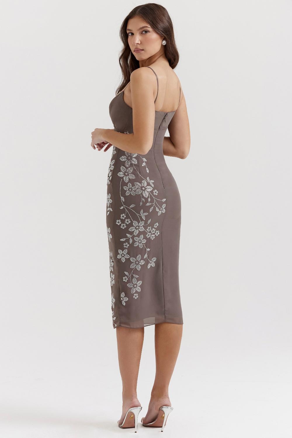 Our 'Blanca' midi dress is cut from georgette and beautifully adorned with luxurious crystals for an ultra glamorous effect. It has a pretty sweetheart neckline and the close fit accentuates the incredibly flattering silhouette.