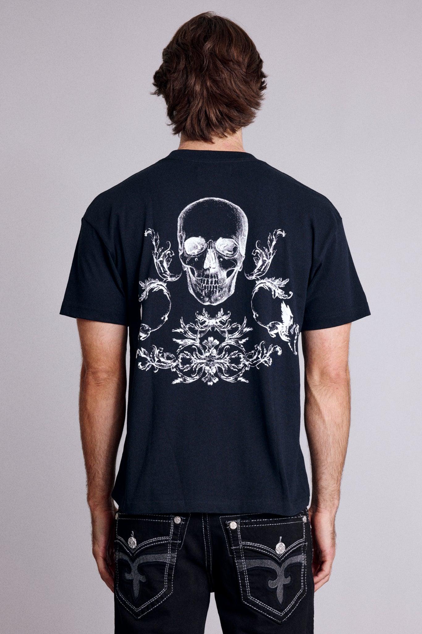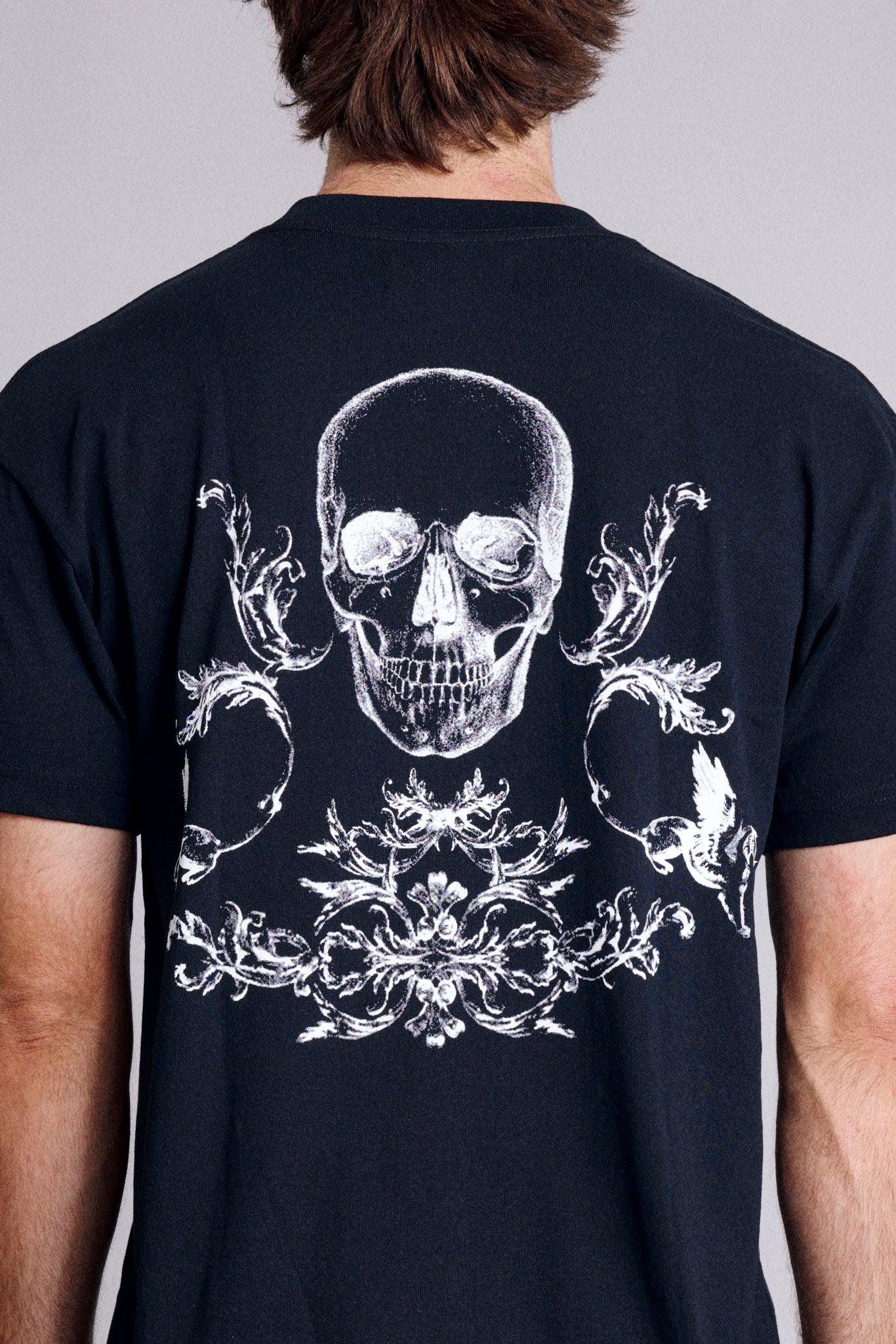 Large skull and ornamental scroll artwork printed across the back