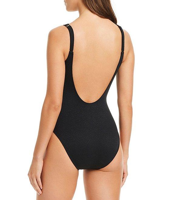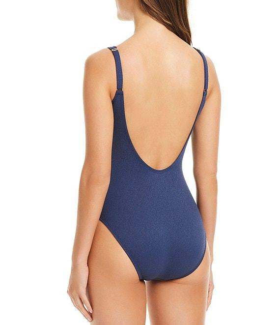 From Bleu Rod Beattie, this swimsuit features: Crepe One piece swimsuit V neckline Hardware Fully lined Pull-on construction Nylon/Spandex Handwash Imported.