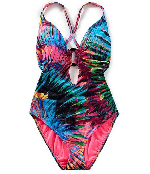 From Bleu Rod Beattie, this one piece swimsuit features: Tank silhouette Plunge neckline Removable soft cups Adjustable straps Keyhole detail Metallic black hardware Open x-back Full coverage Lined Pull-on construction Nylon/spandex Hand wash Imported.