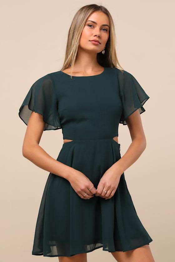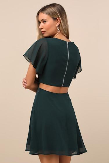 Get swept off your feet in the Lulus Blissful Love Dark Green Cutout Mini Skater Dress! Elegant chiffon shapes this stunning dress featuring a rounded neckline, short fluttery sleeves, and a darted bodice. High fitted waist tops a flirty skater skirt while a back cutout adds a little something extra that's sure to turn heads. Exposed silver zipper at back, plus hidden side zipper/clasp.