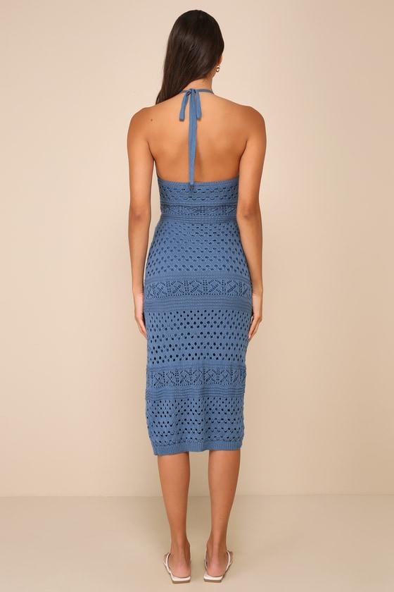 Slip into the Lulus Blissful Strolls Slate Blue Crochet Faux-Wrap Halter Midi Dress and take a leisurely walk through the palms! This vacay-ready crochet-knit dress has a tying halter neckline and a fitted bodice with a flirty open-back design. The high waist sits atop a column skirt that boasts an overlapping panel that ties at the hip to create a wrap effect, all before ending at a modern midi hem.