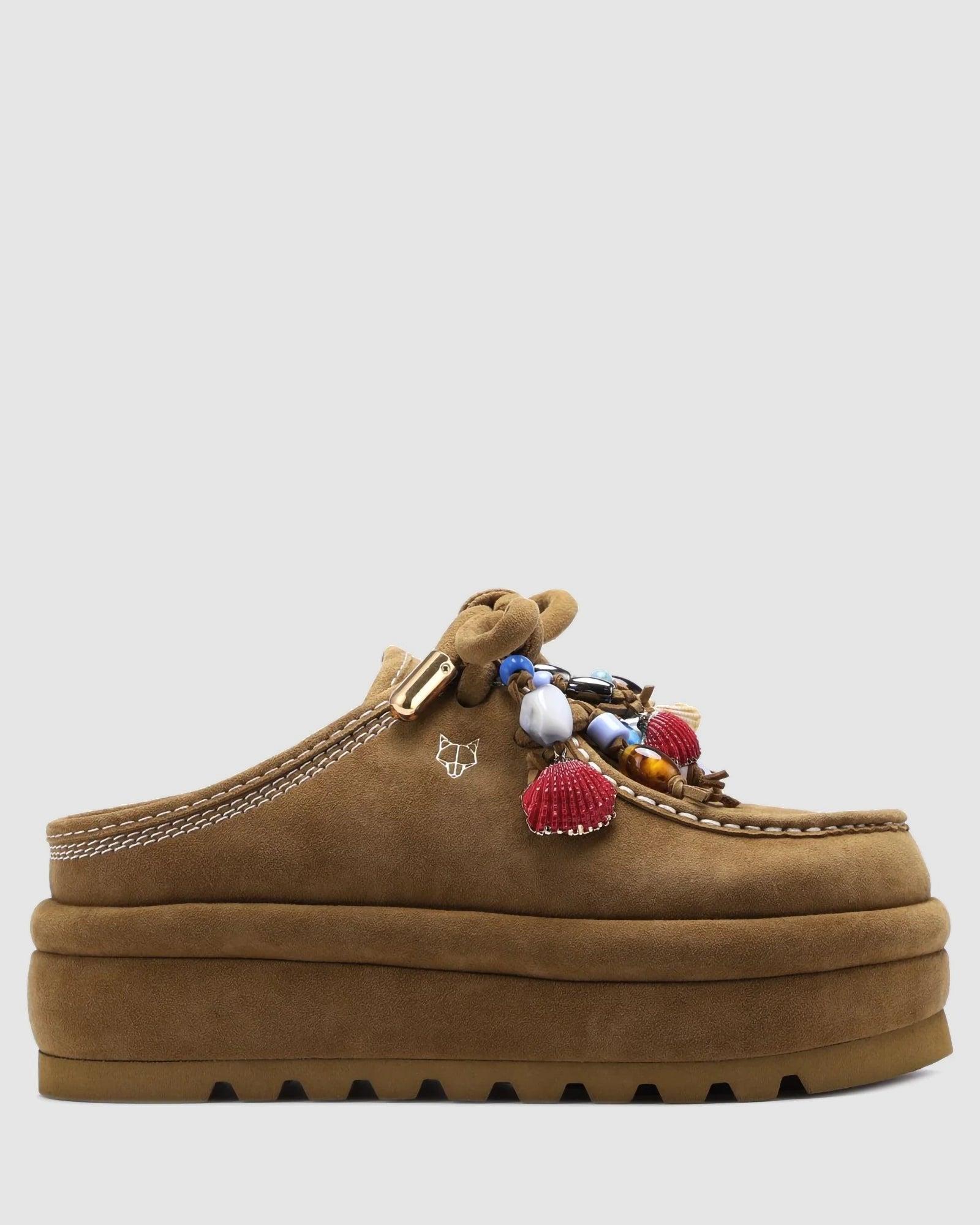 Introducing the Blizzard slip-on from Naked Wolfe, a backless shoe that combines luxury and modern comfort. Crafted from premium suede, it features a cozy wool lining and a leather sock for exceptional comfort. The shoe boasts a 60mm heel height and a chunky super light tread for an elevated look. Thick suede leather round laces with branded metal lace tips add a touch of luxury to any casual look, while an embossed logo and a big Wolfe head key chain enhance its distinctive design. This specific pair features shell charm detailing attached at the front. Each pair has a hand crafted dirty finish. Perfect for making a statement, the Blizzard slip-on is a must-have addition to your footwear collection