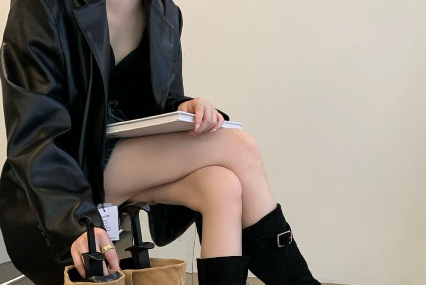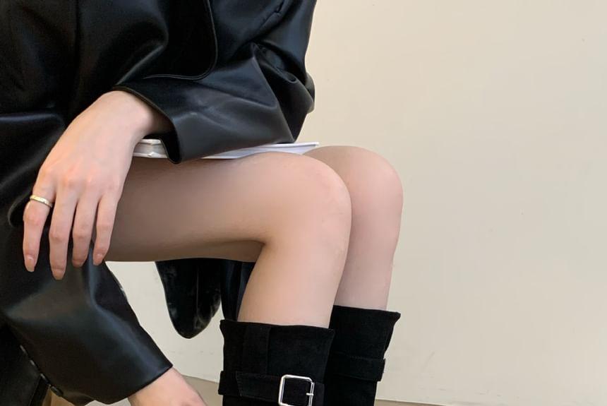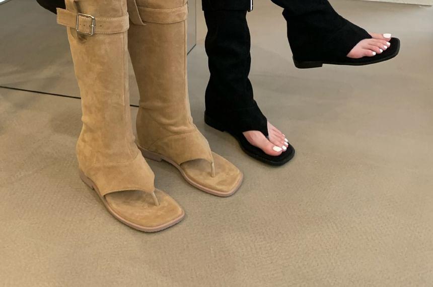 Block Heel Square Toe Plain Buckled Faux Suede Flip-Flops Mid-Calf Boots
