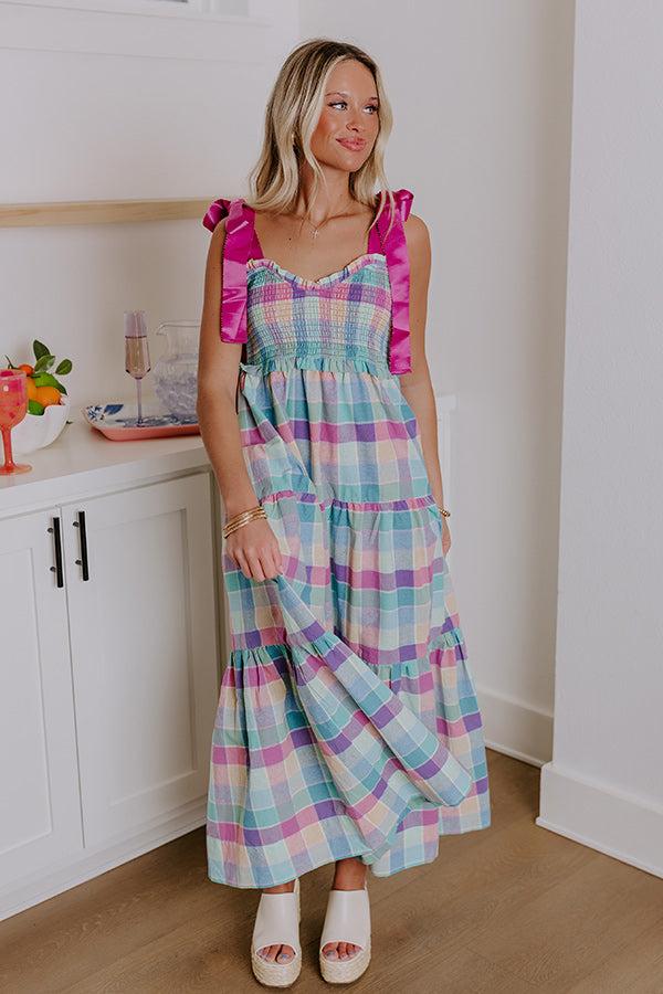 - Be a block party babe in this adorable midi dress! Colorful plaid material and sweet tied straps make this piece a total charmer. - A sweetheart neckline with pleated detailing - Satin-finished straps that tie into bows at the tops of the shoulders - A smocked bodice - An elastic waistline with ruffle detailing - Hidden side pockets - A flowy and flattering silhouette that ends in a midi length hemline