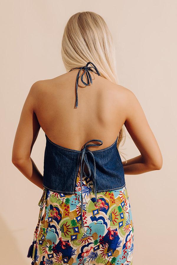 - From sunny days to chic nights, this trendy denim halter top brings all the flirty vibes with its open back and playful silhouette. A must-have statement piece for anyone loving that casual-cute look!