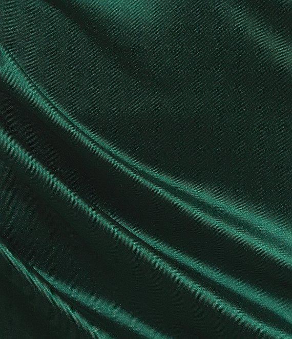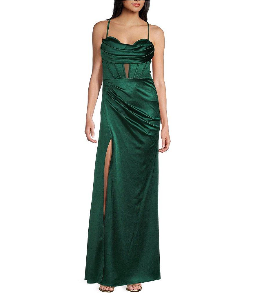 From Blondie Nites, this dress features: Power sateen fabrication Drape neckline Spaghetti straps Corset bodice Tie back closure Lining Approx. 60" length Polyester/spandex/nylon Dry clean Imported.