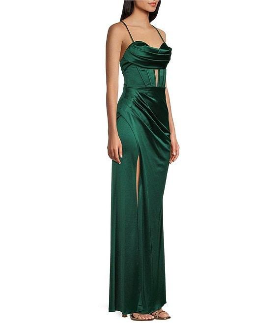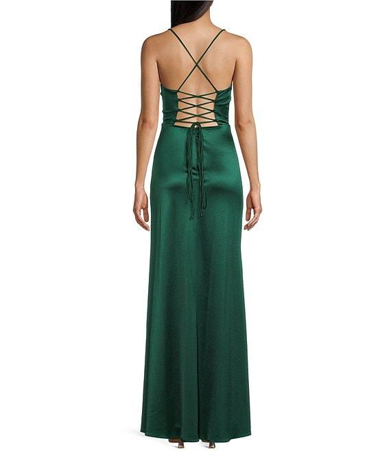 Blondie Nites Power Sateen Drape Neck Spaghetti Straps Corset Lace Up Back Dress