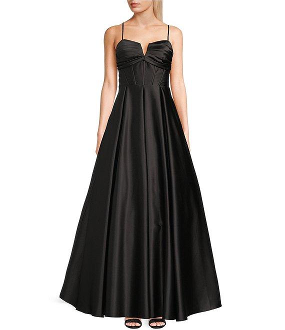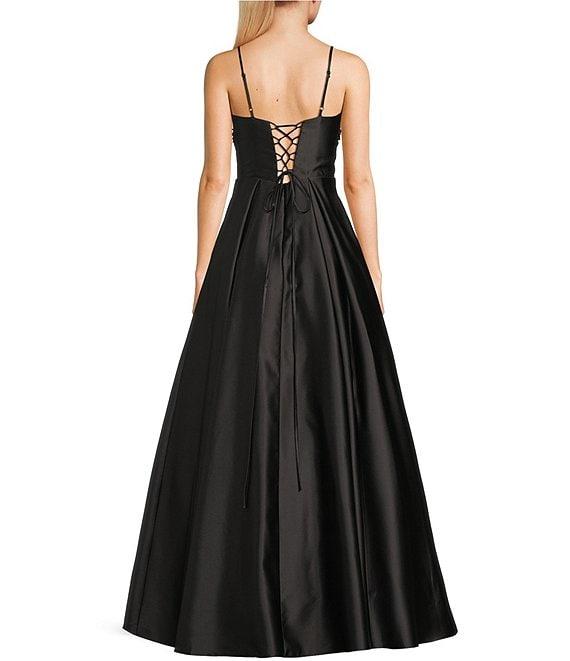Blondie Nites Satin V-Notch Front Spaghetti Strap Tie Back Gown