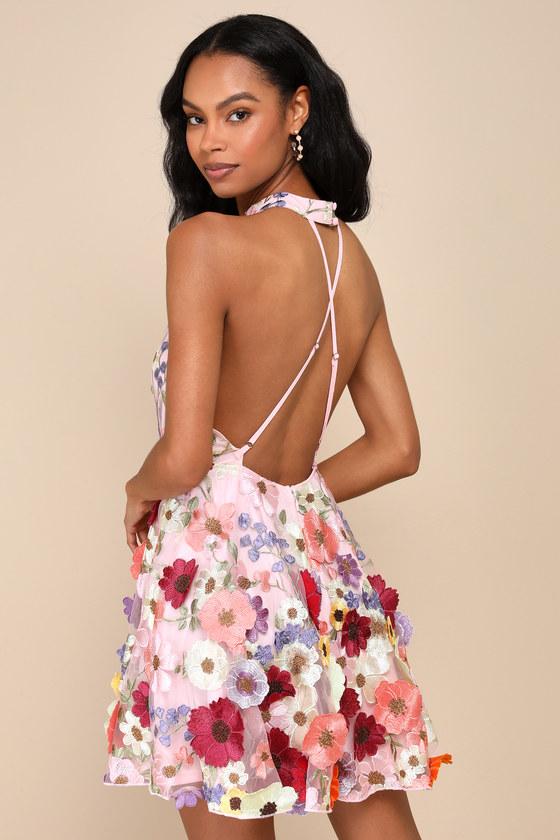 You're sure to be the star of every garden party in the Lulus Blooming Bliss Pink 3D Floral Embroidered Halter Mini Dress! Airy tulle overlays this sunny dress, boasting a profusion of floral embroidery and floral applique details, some of which have a 3D effect at the edges. Halter neckline has loop-button closures at back, atop a lightly gathered bodice with an open back (with two adjustable crisscrossing spaghetti straps for additional support). Fitted waist tops a flirty circle skirt that finishes at a mini hem. Hidden zipper/clasp at back.