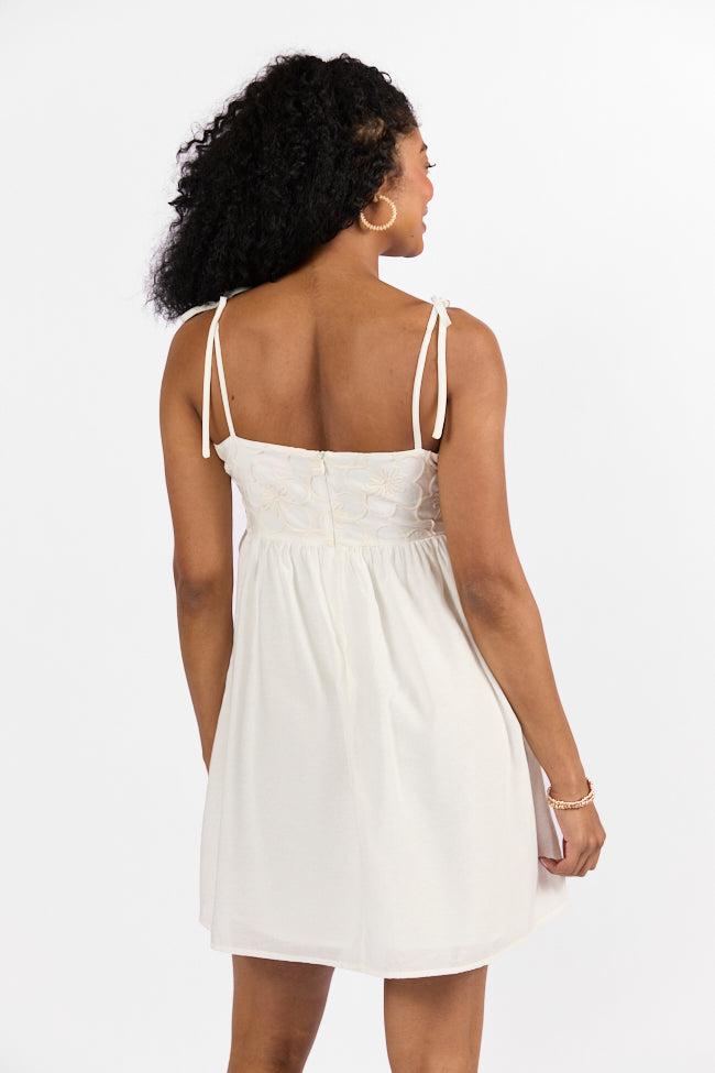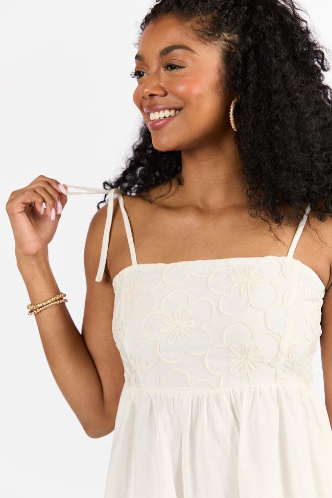 Details Ivory Embroidered Floral Dress Fabric has no stretch Adjustable tie straps, embroidered flowers, back zipper closure Lined Size small from shoulder to hem: 26.5" Material and Care Shell: 100% polyester, lining: 95% polyester 5% elastane Machine wash cold, no drum drying Patterns may vary Materials may have natural variations Colors may vary from different viewing devices.