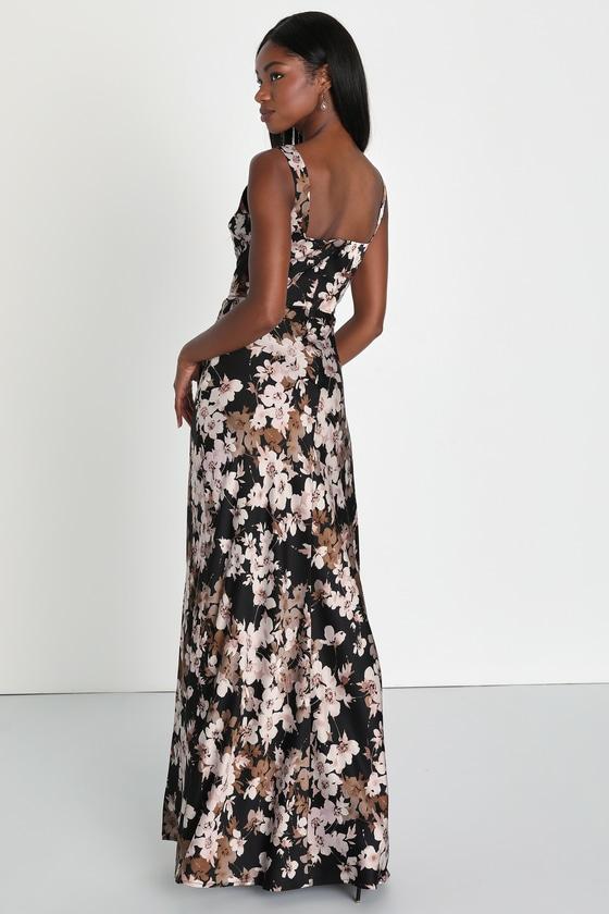 You'll inspire compliments everywhere you go in the Lulus Blossoming Aura Black Floral Square Neck Tulip Maxi Dress! Sleek woven satin, with an elegant floral print throughout, shapes wide tank straps that glow into a square neckline and a darted bodice. High, fitted waist features flattering pleating along the side before continuing into an overlapping, tulip skirt that ends at a sweeping maxi hem. Hidden back zipper/clasp.