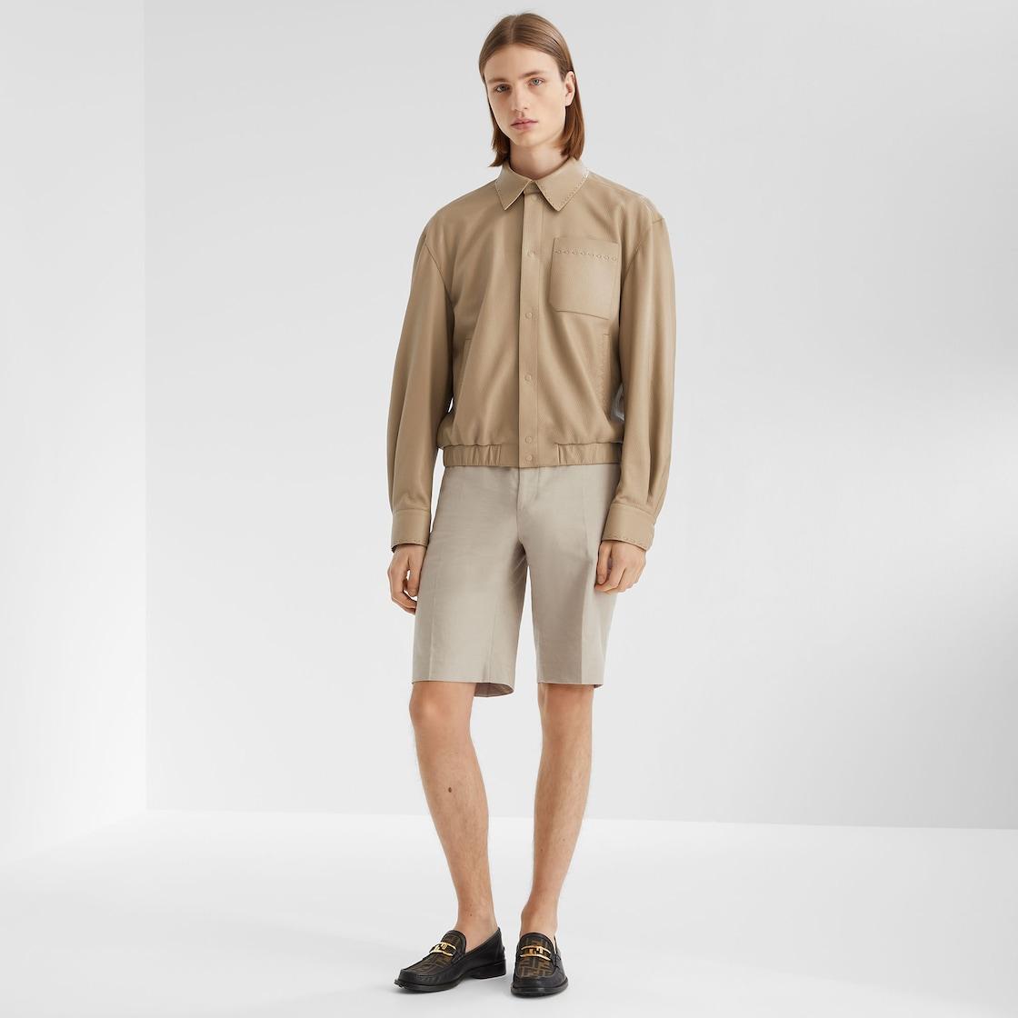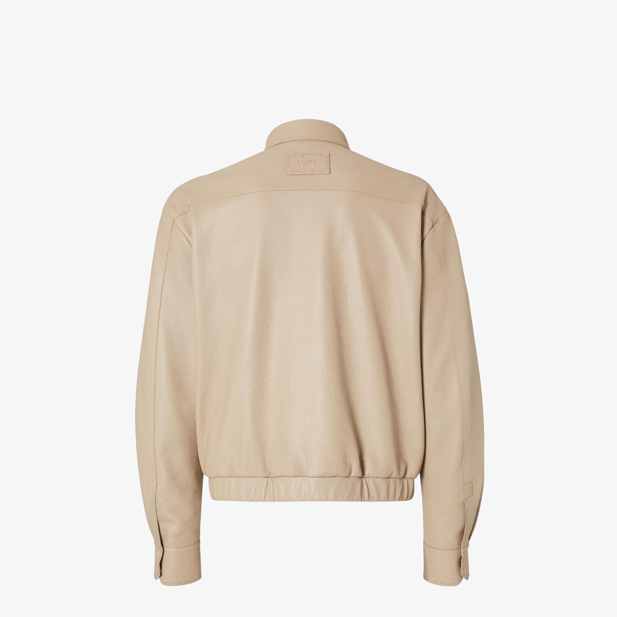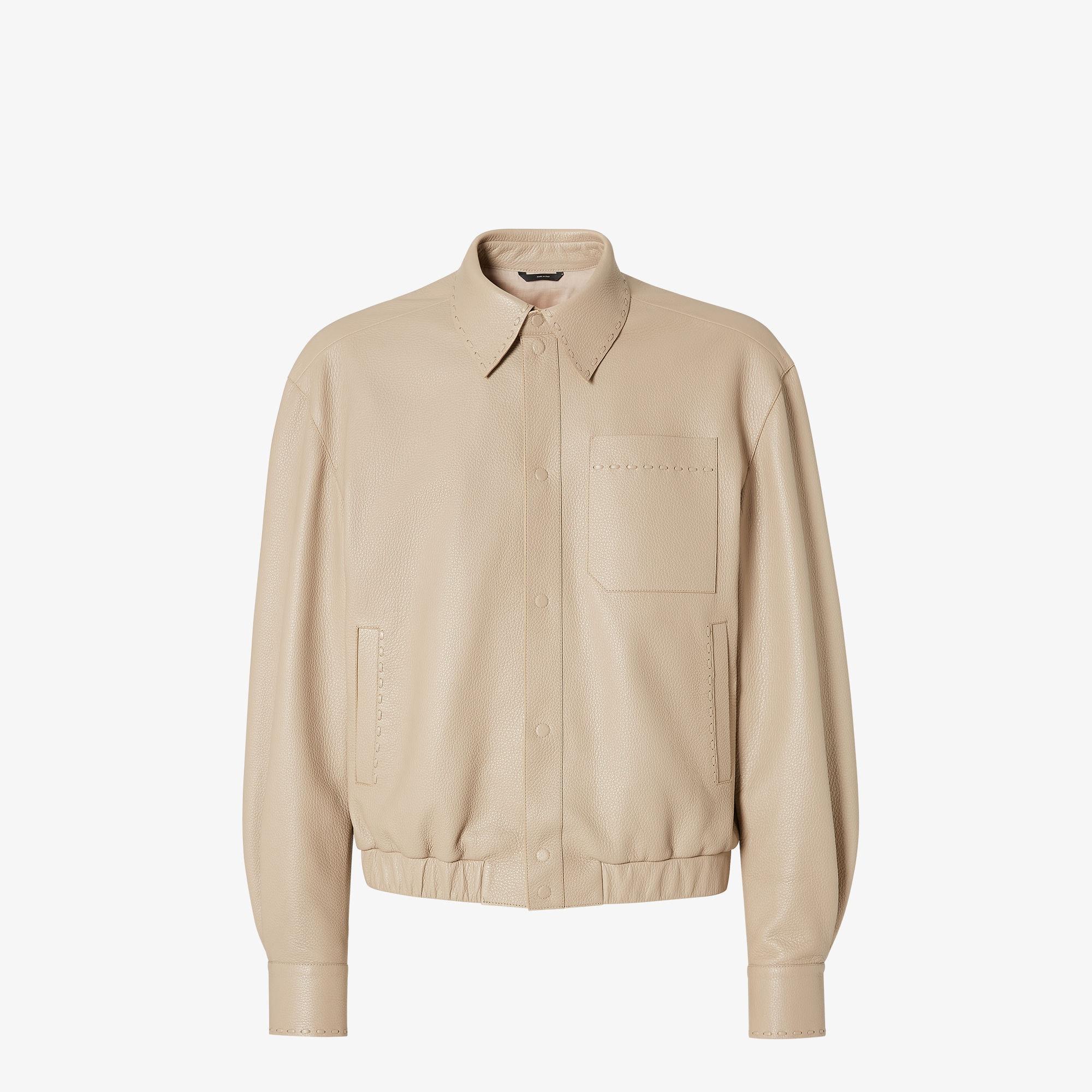 Short blouson with shirt collar and elastic edge. Long sleeves, side pockets and small patch pocket on the chest. Snap closure. Made of soft, beige hammered leather. Embellished with raised micro Selleria stitching in the same tone. Made in Italy