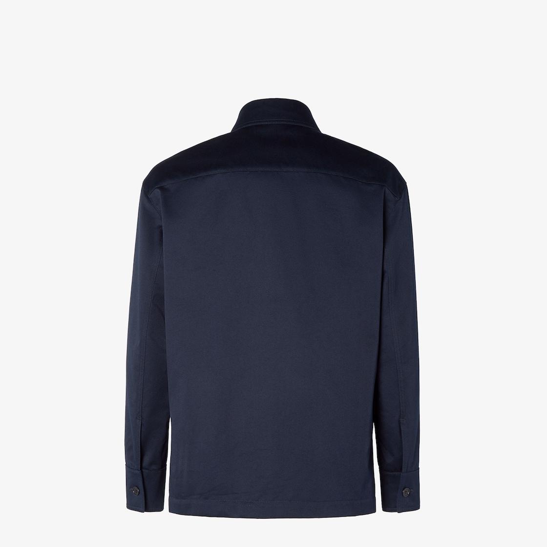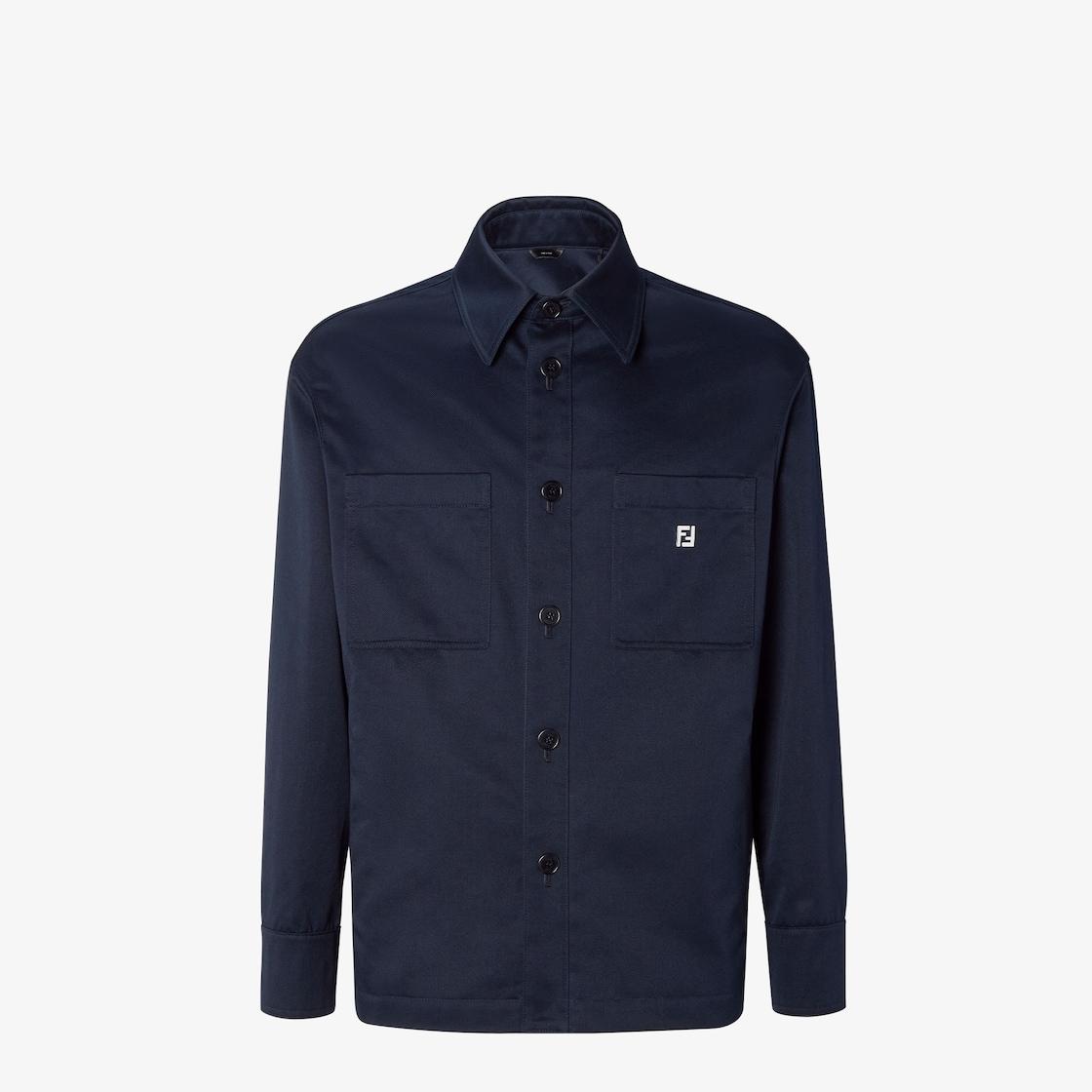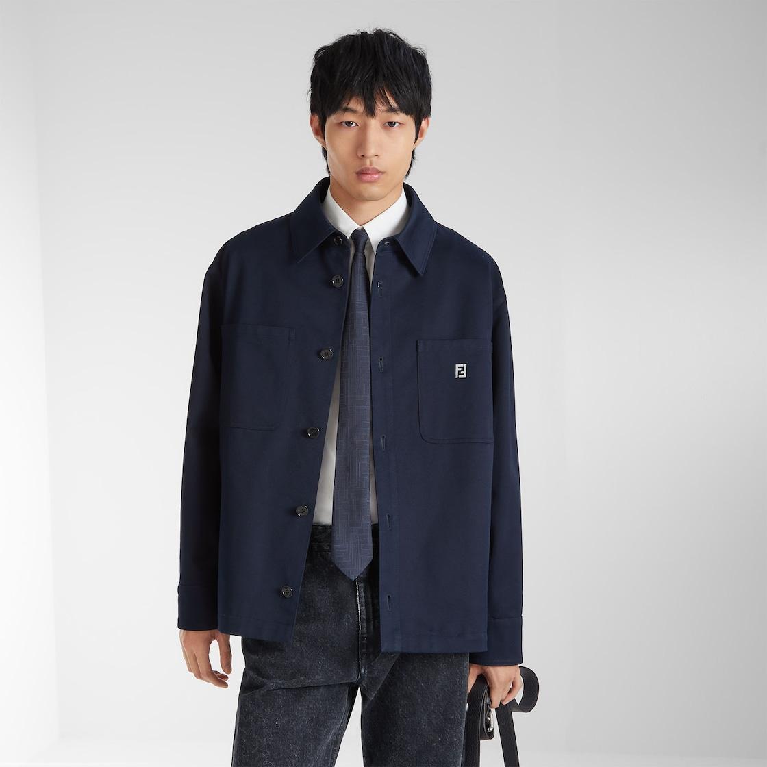 Oversized, long-sleeved blouson. Shirt collar and patch pockets on the chest. Visible front button closure. Made of dark blue double gabardine. Left pocket customized with micro FF detail in palladium metal. Made in Italy