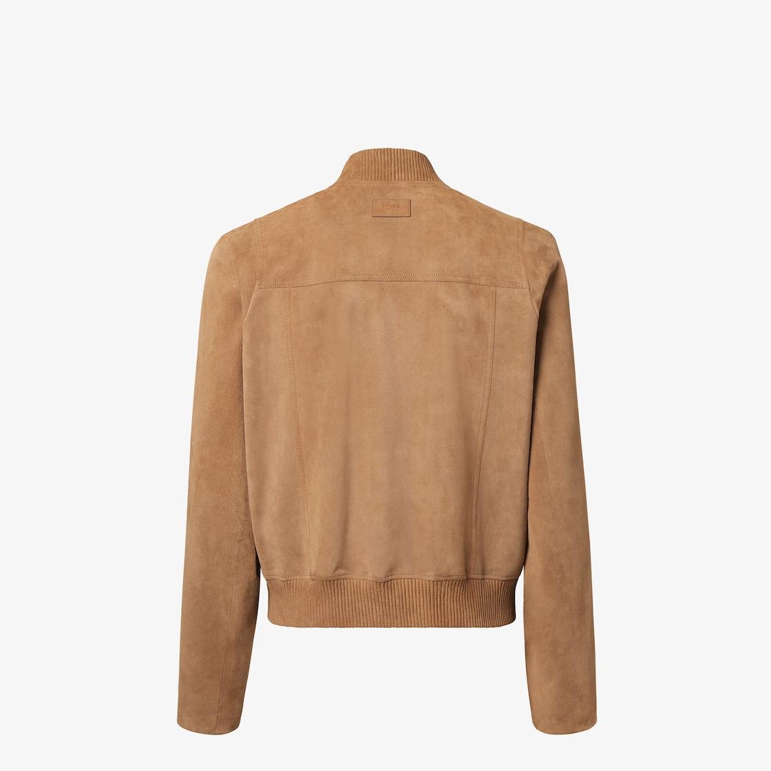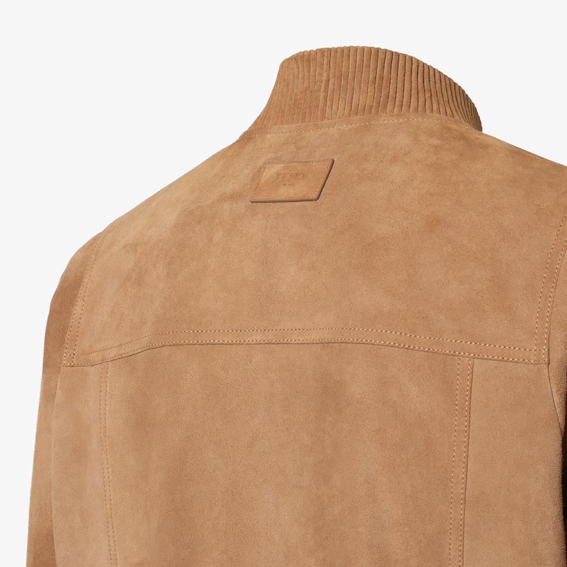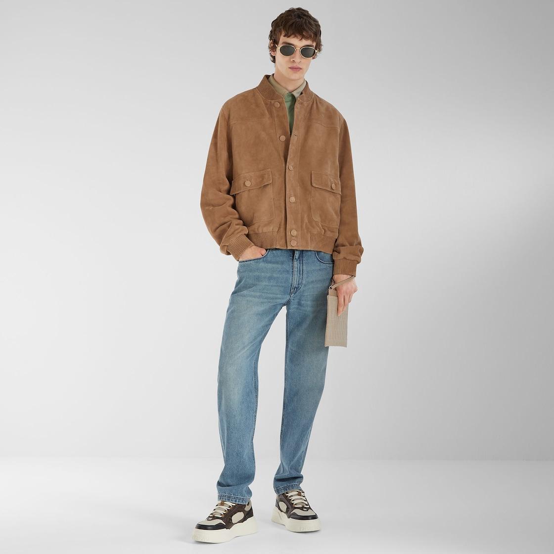 Bomber jacket with ribbed collar and edge. Large patch pockets on the front with flap and button. Front fastening with matching buttons. Lined. Made of light brown suede. Embellished with matching Fendi Roma patch on the back of the collar. Made in Italy