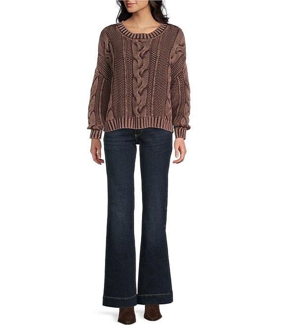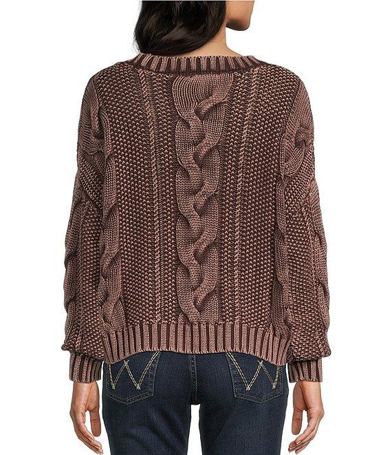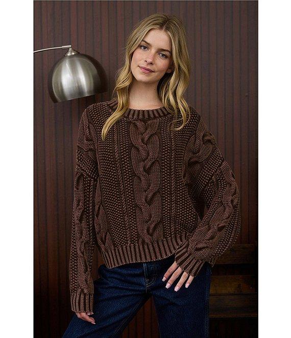 Blu Pepper Acid Wash Cable Knit Round Neck Long Sleeve Sweater