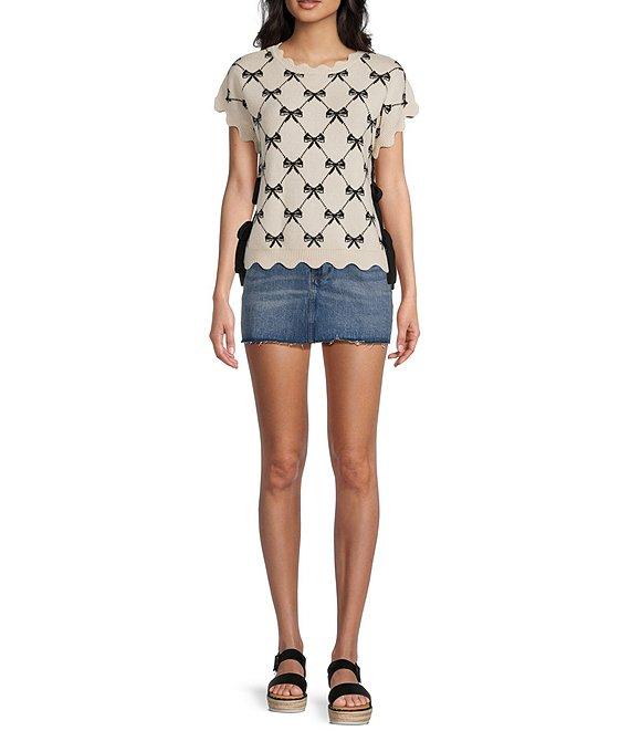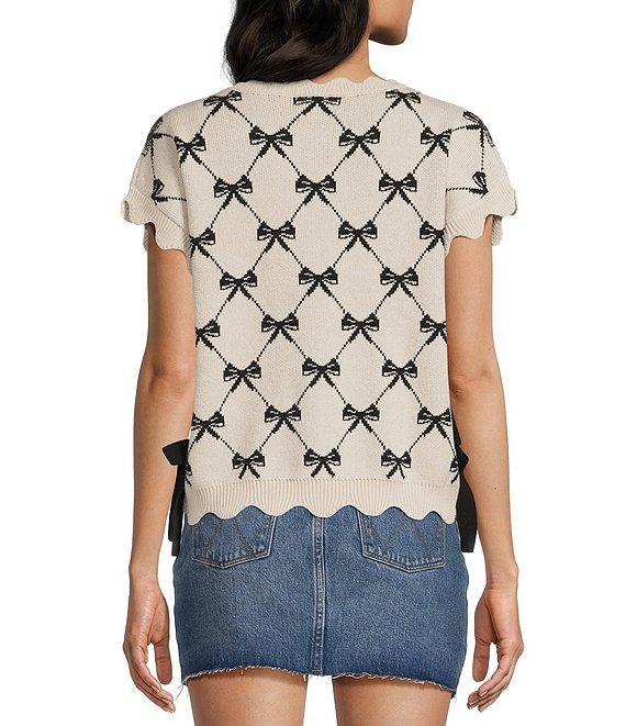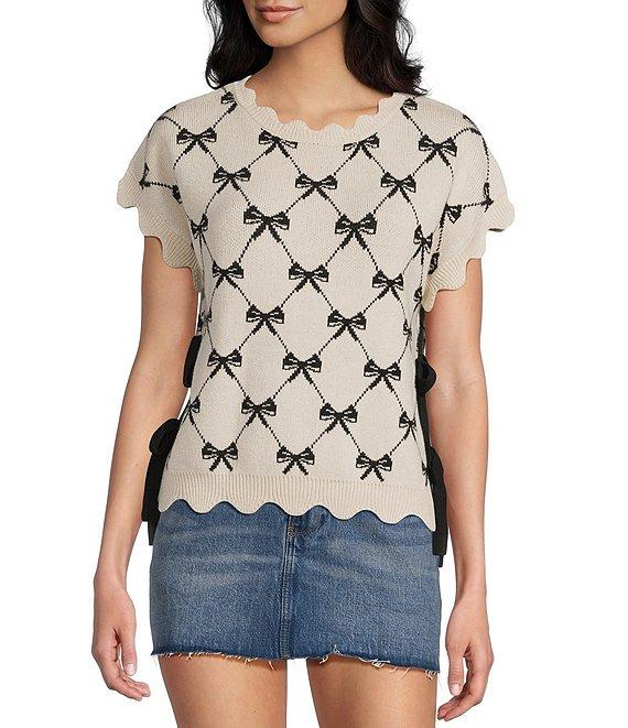 From Blu Pepper, this sweater features: Allover bow pattern Round neckline Short sleeves Side-tie detail Pullover styling Rayon/polyester/nylon Hand wash/lay flat to dry Imported.